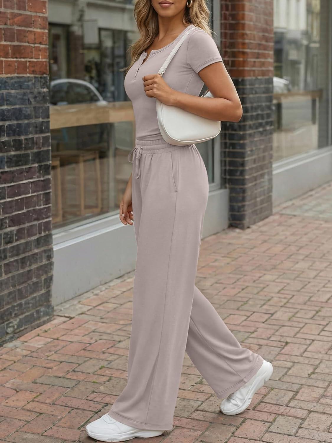 Trendy Queen Women’s 2 Piece Matching Lounge Sets Summer Henley Neck Slightly Crop Top Wide Leg Pants Casual Sweat Suit(Rose Taupe)