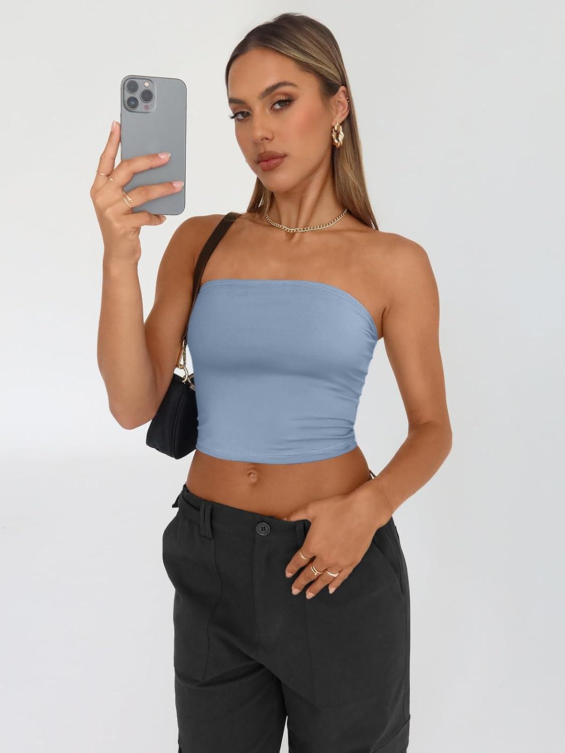 Trendy Queen Womens 3 Pack Tube Tops Crop Going Out Strapless Basic Backless Bandeau Bra Summer Outfits 2026(Black white light Blue)