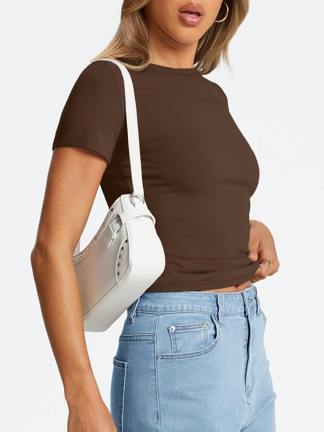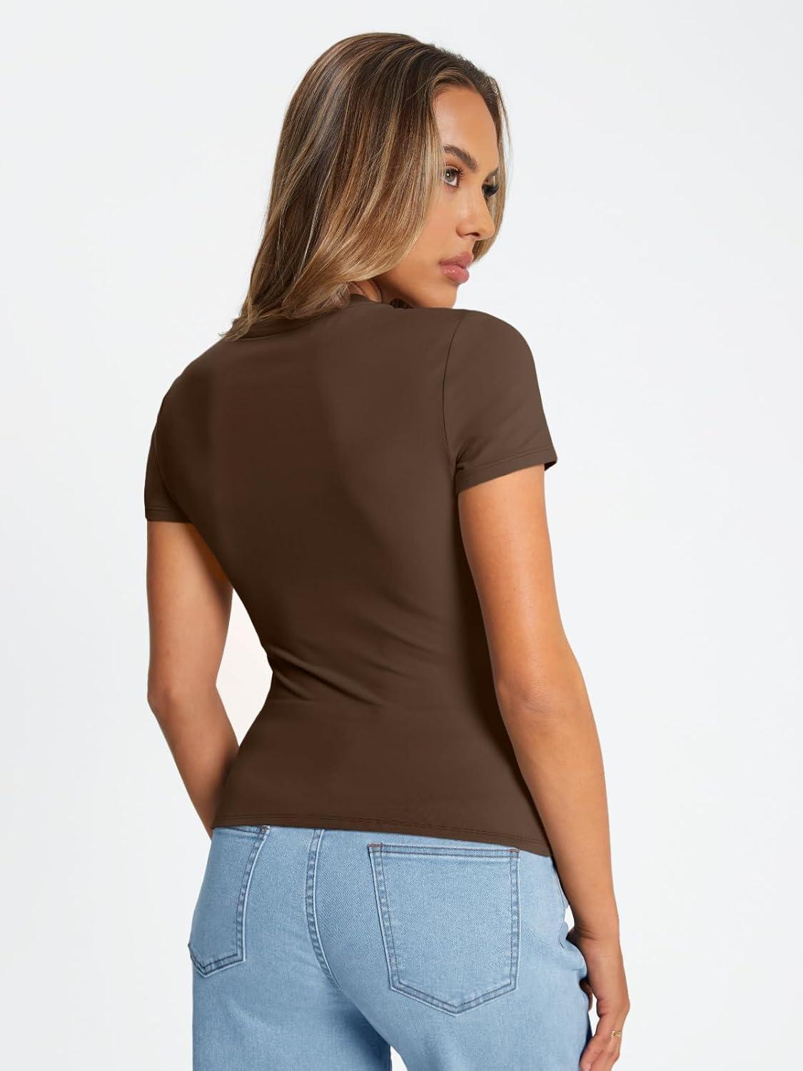 image:imageTrendy Queen Womens Basic T Shirts Summer Tops 2026 Crop Short Sleeve Slim Fit Tee Cute Gym Workout ClothesChocolate Brown
