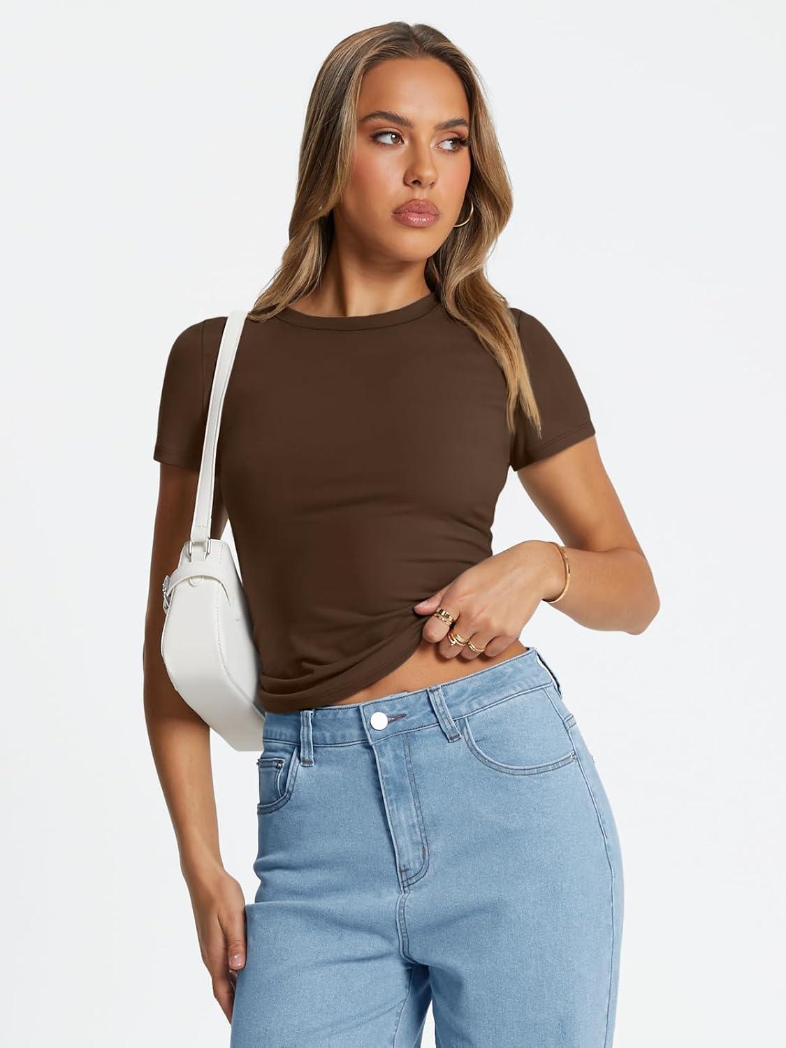 Trendy Queen Womens Basic T Shirts Summer Tops 2026 Crop Short Sleeve Slim Fit Tee Cute Gym Workout Clothes(Chocolate Brown)