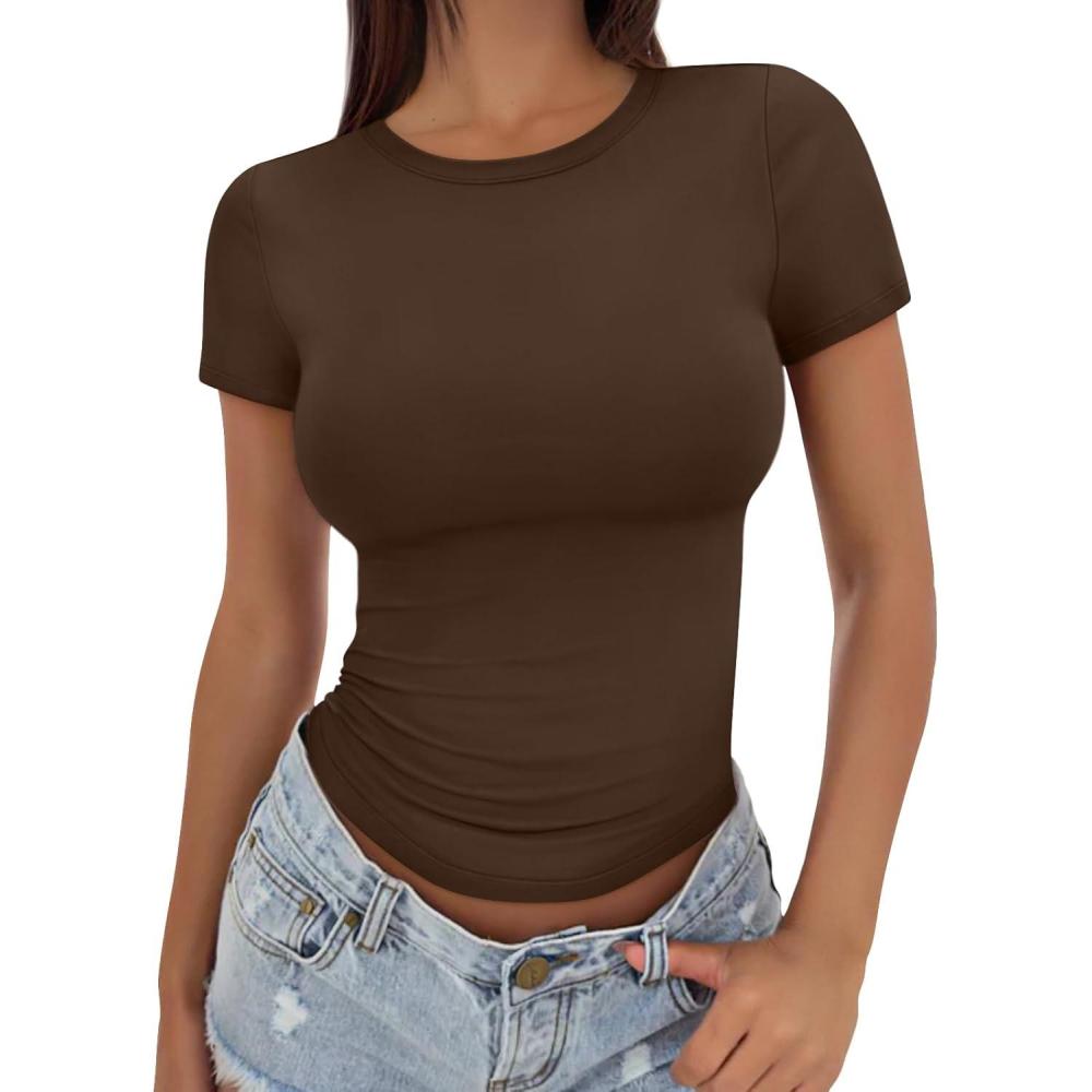 Trendy Queen Womens Basic T Shirts Summer Tops 2026 Crop Short Sleeve Slim Fit Tee Cute Gym Workout Clothes(Brown)