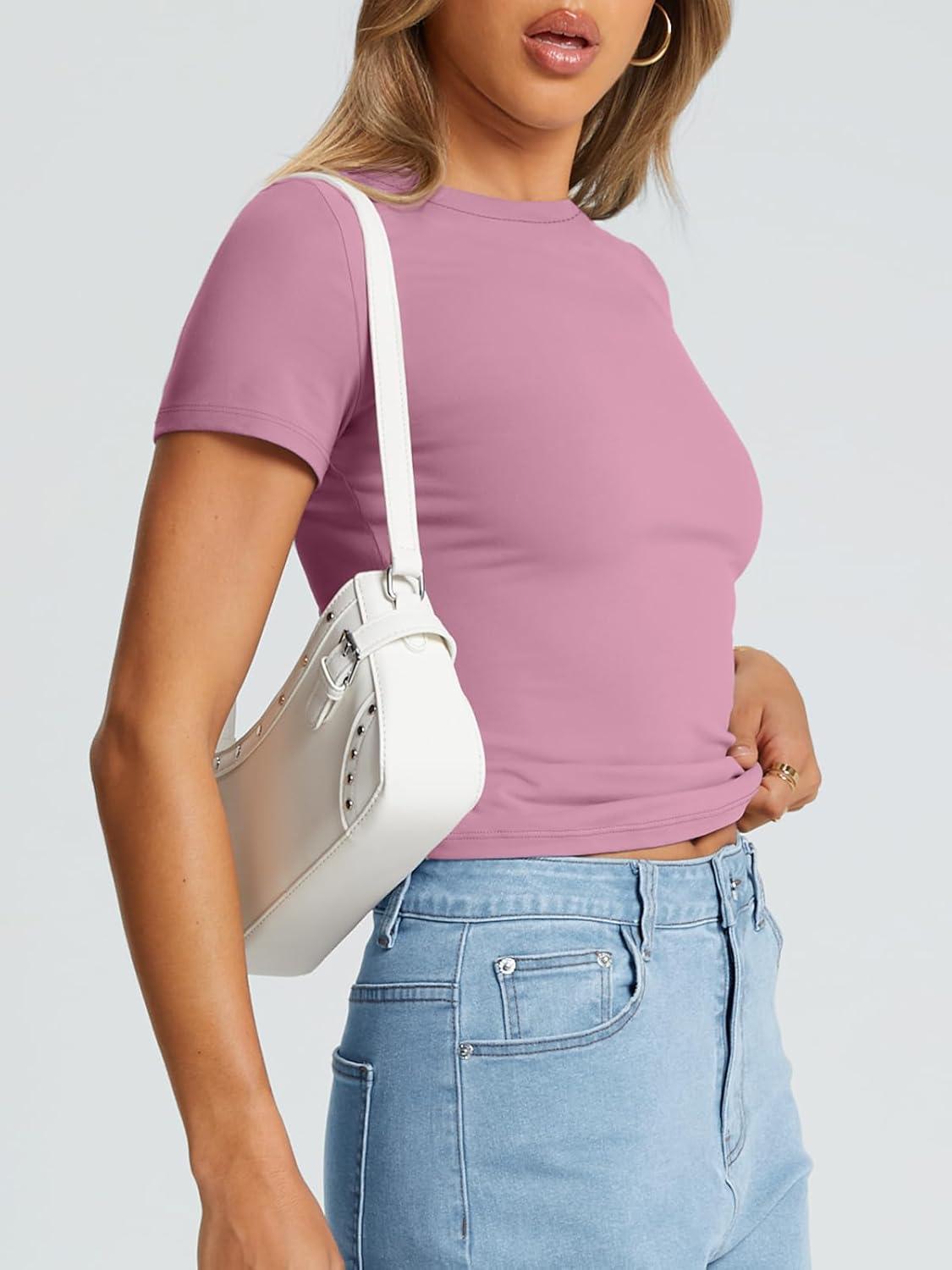 Trendy Queen Womens Basic T Shirts Summer Tops 2026 Crop Short Sleeve Slim Fit Tee Cute Gym Workout Clothes(Lightpink)
