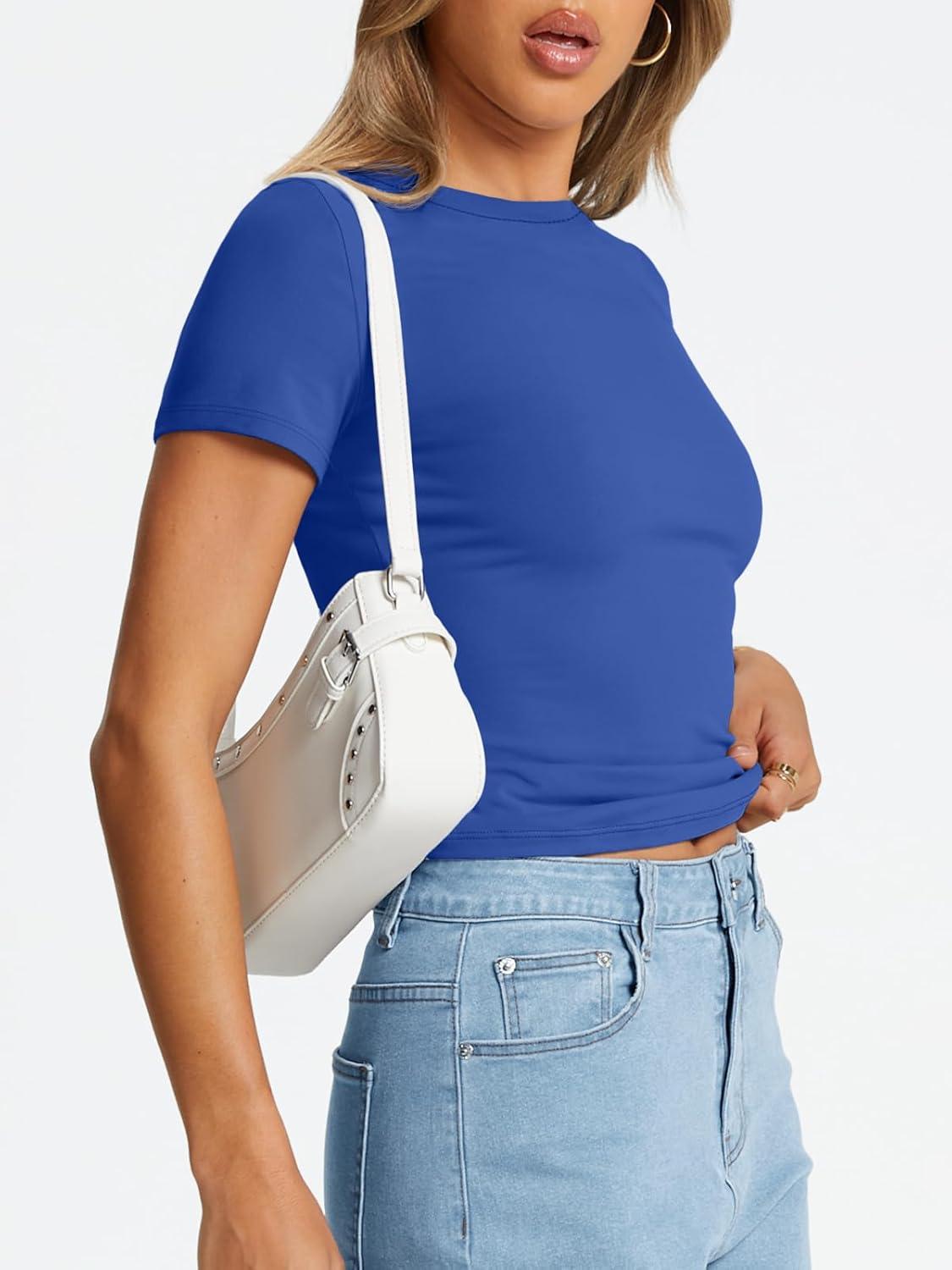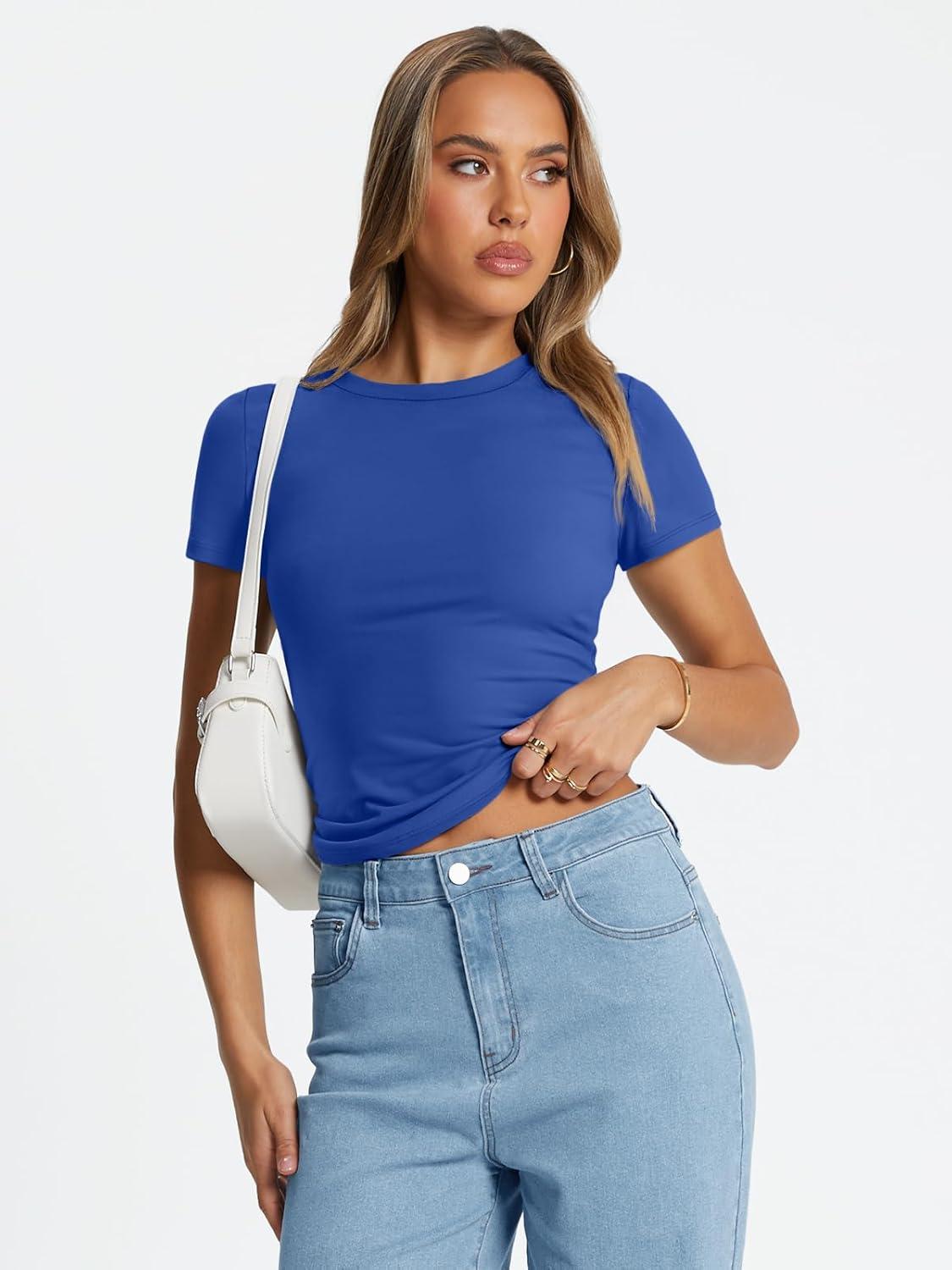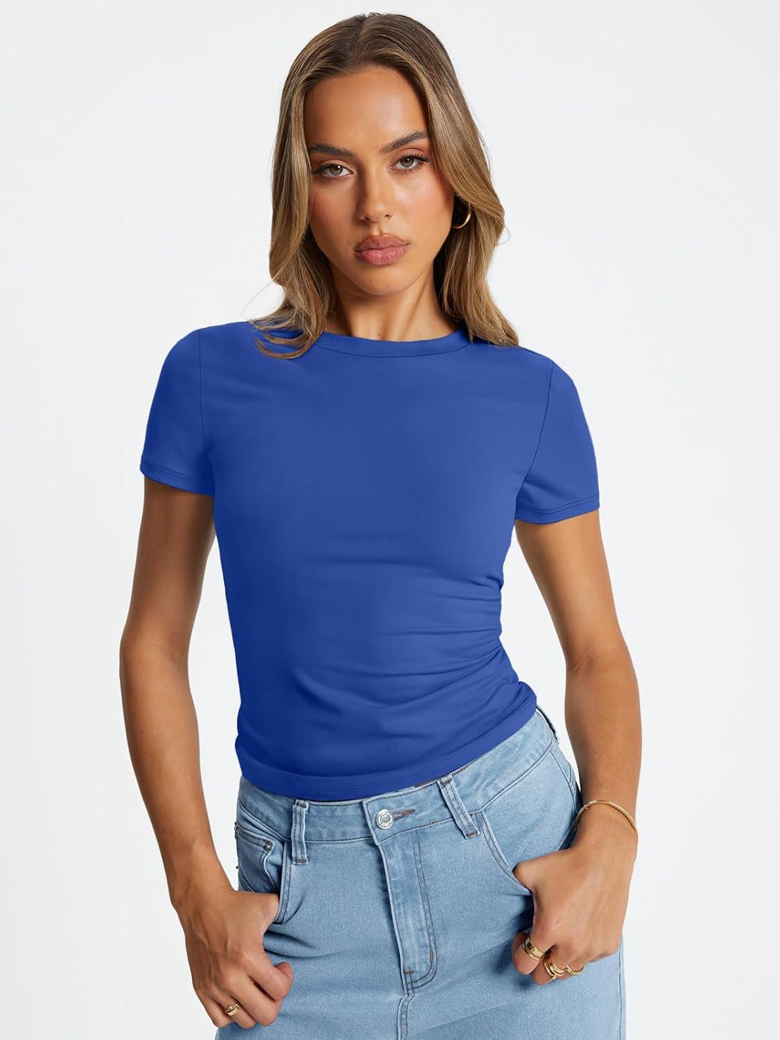 Trendy Queen Womens Basic T Shirts Summer Tops 2026 Crop Short Sleeve Slim Fit Tee Cute Gym Workout Clothes(Royal Blue)