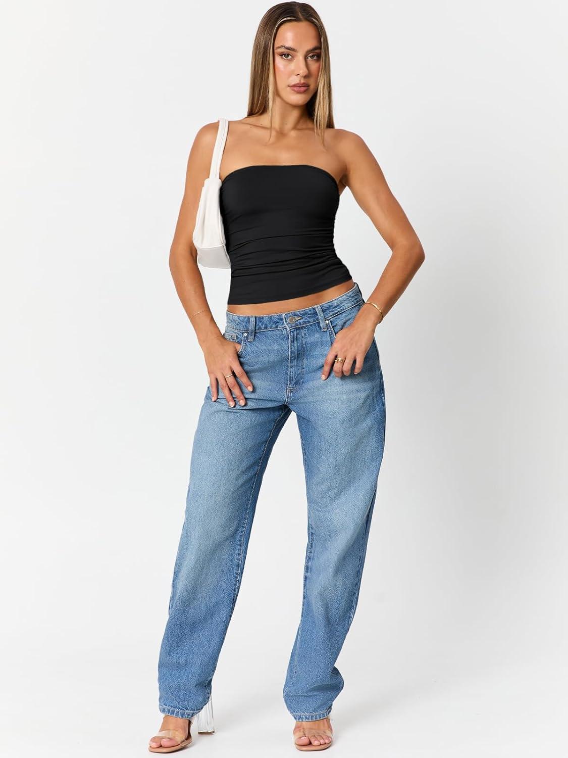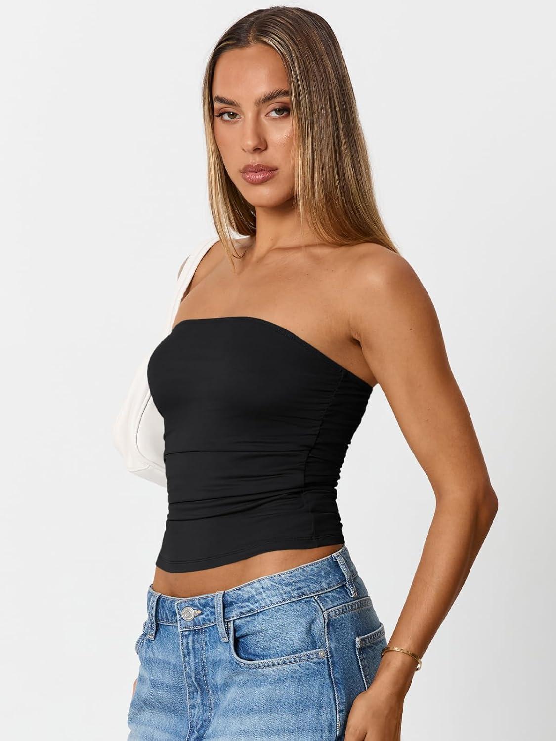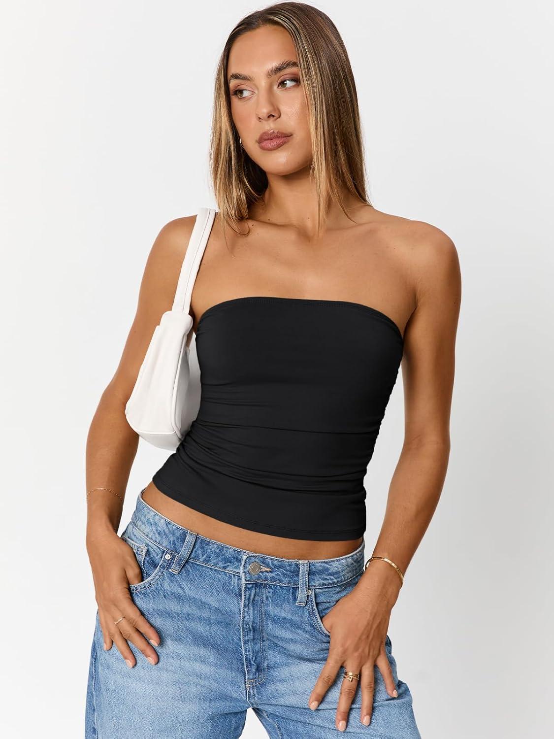 Trendy Queen Womens Cute Summer Tube Tops Going Out Strapless Ruched Backless Sleeveless Bandeau Y2k Clothes 2025(Black)