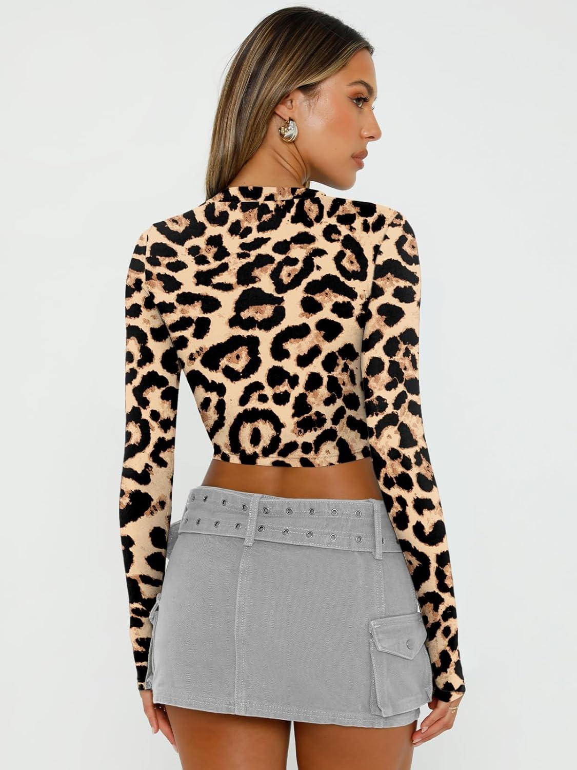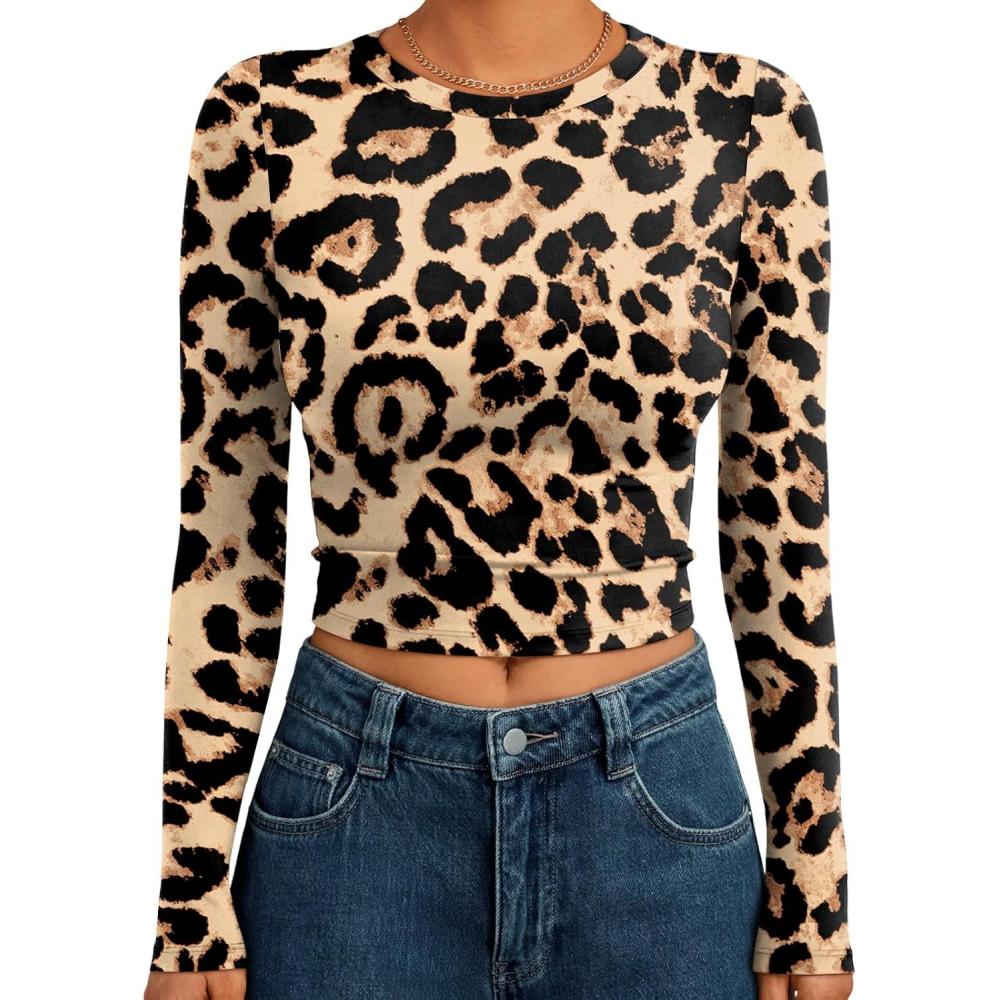 Trendy Queen Womens Long Sleeve Crop Tops Basic Slim Fitted Shirts Spring Fashion Outfits 2026 Teen Girl Clothes(Black Leopard)