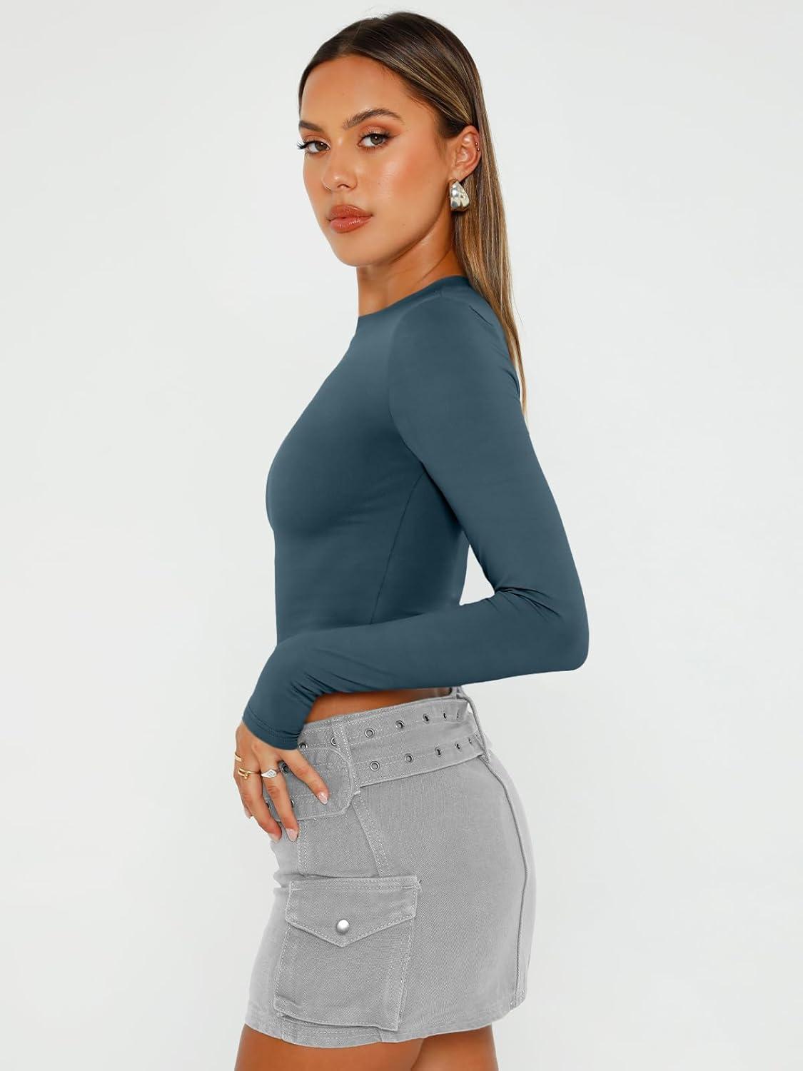 Trendy Queen Womens Long Sleeve Crop Tops Basic Slim Fitted Shirts Spring Fashion Outfits 2026 Teen Girl Clothes(Haze Blue)