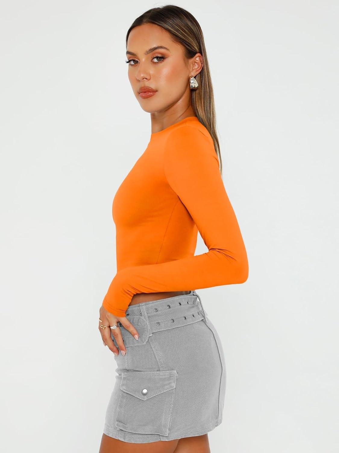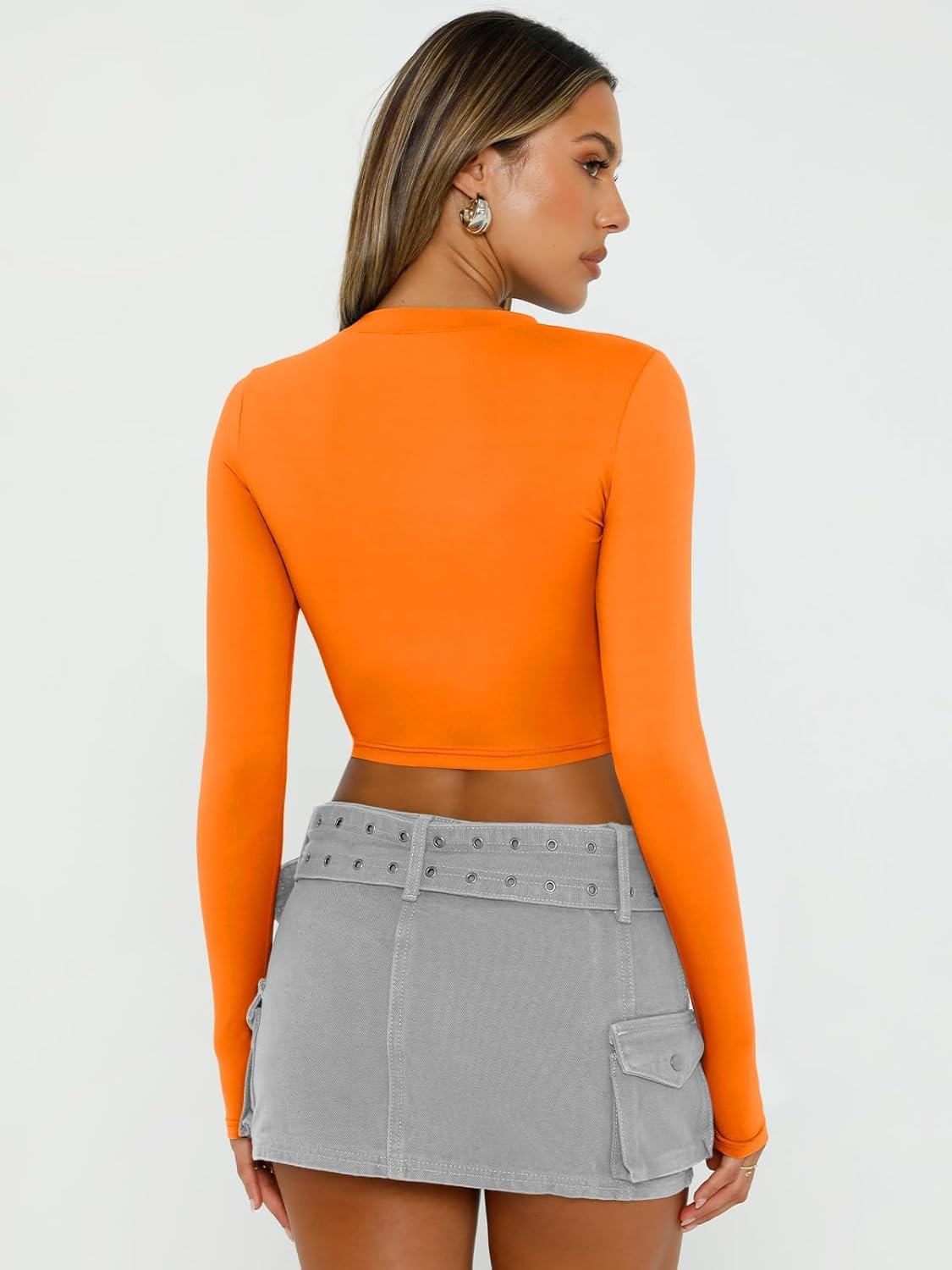 Trendy Queen Womens Long Sleeve Crop Tops Basic Slim Fitted Shirts Spring Fashion Outfits 2026 Teen Girl Clothes(Orange)