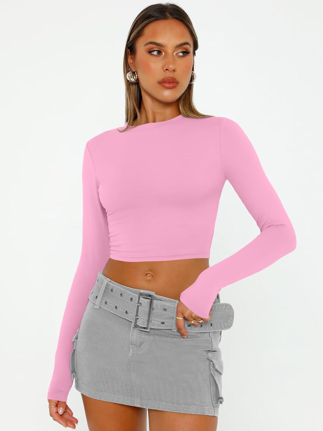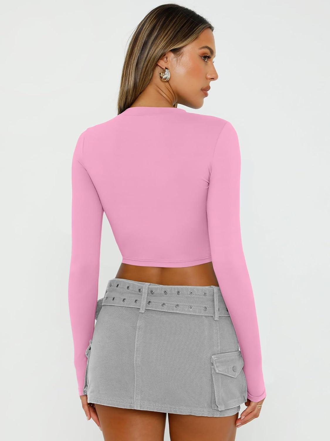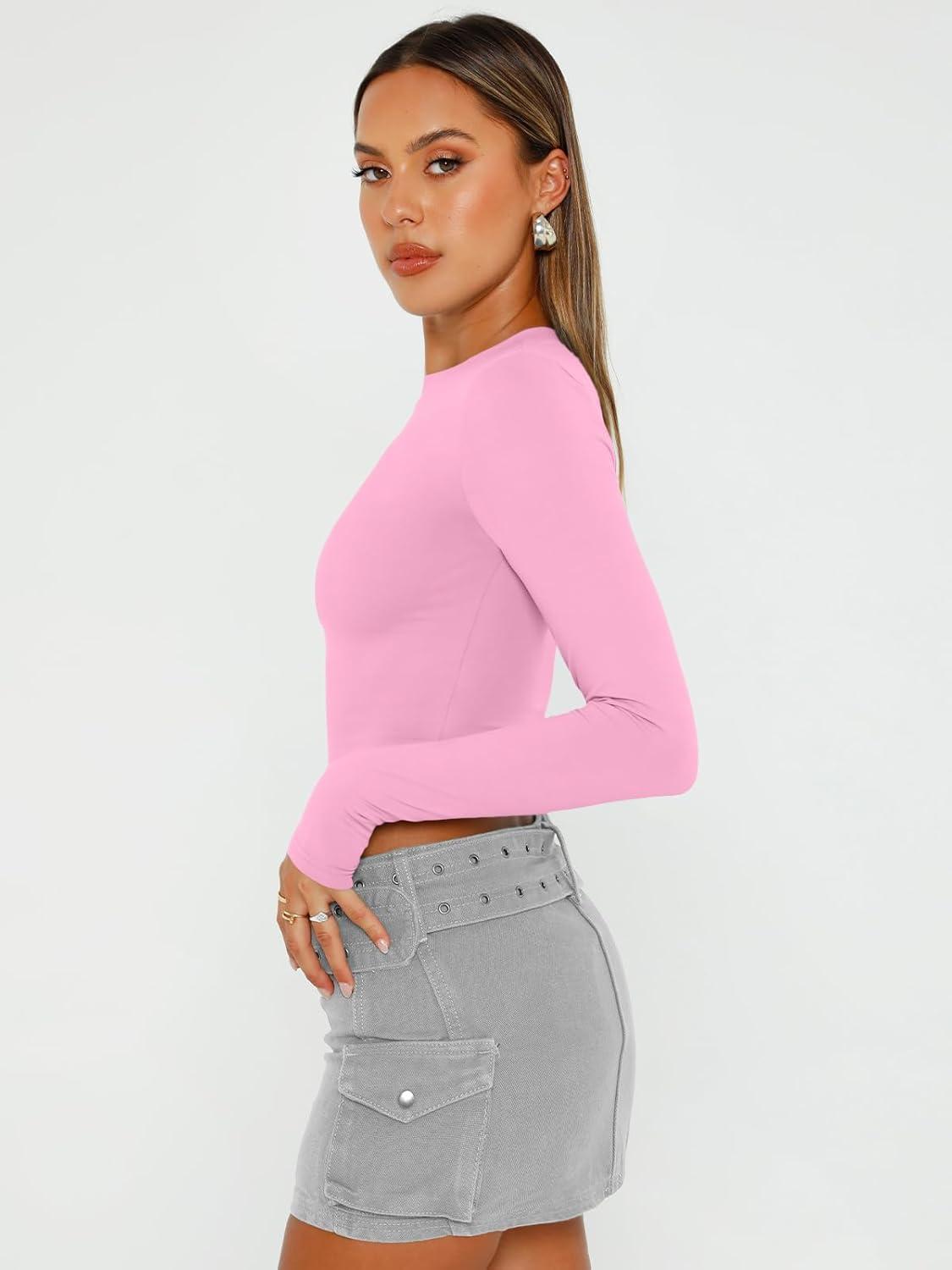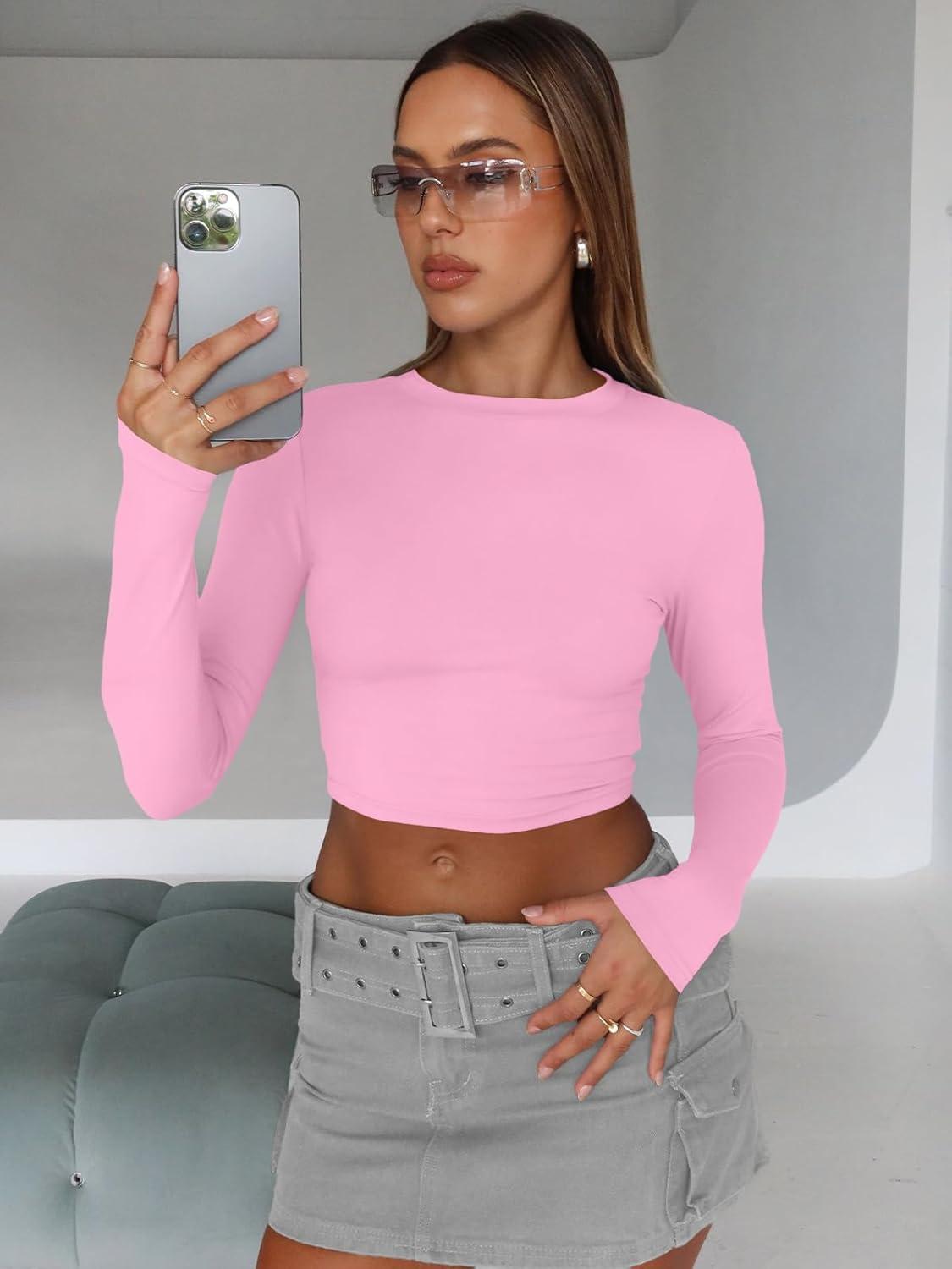 Trendy Queen Womens Long Sleeve Crop Tops Basic Slim Fitted Shirts Spring Fashion Outfits 2026 Teen Girl Clothes(Rose Pink)