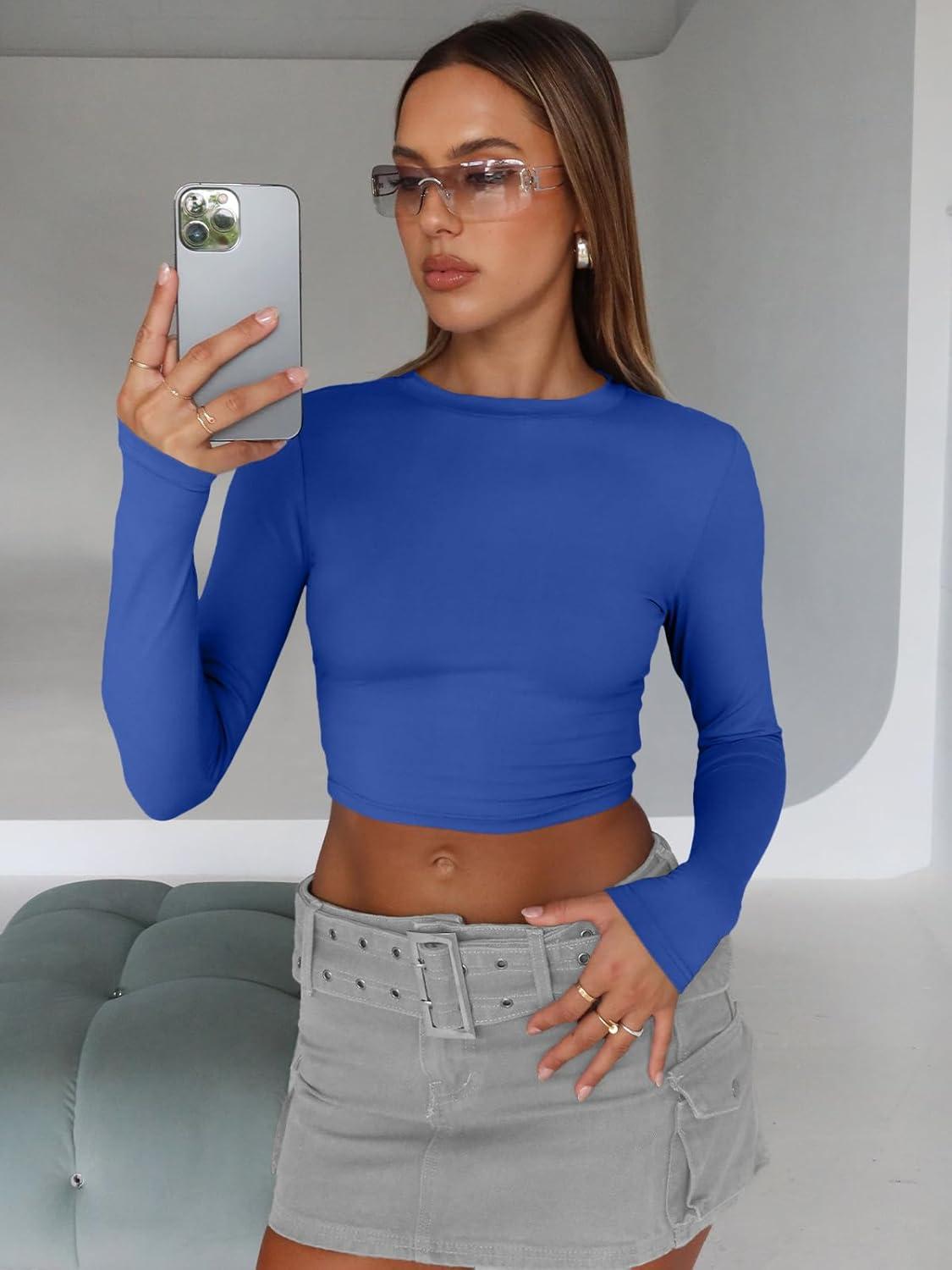 Trendy Queen Womens Long Sleeve Crop Tops Basic Slim Fitted Shirts Spring Fashion Outfits 2026 Teen Girl Clothes(Royal Blue)