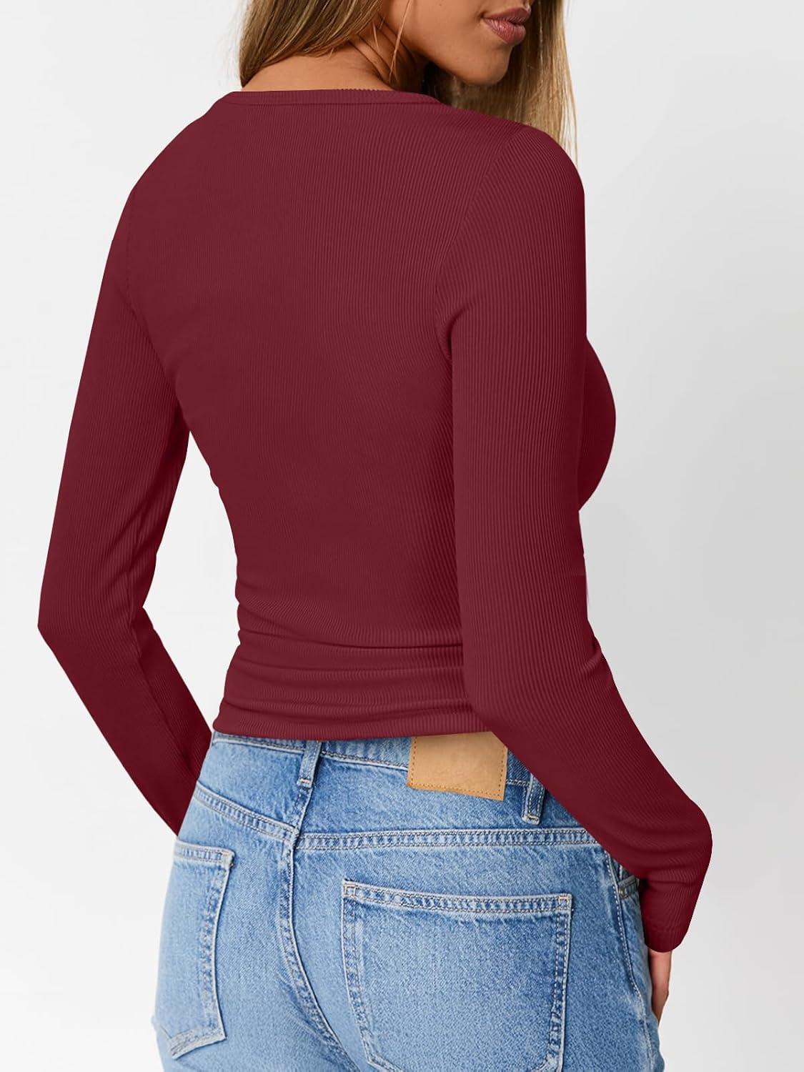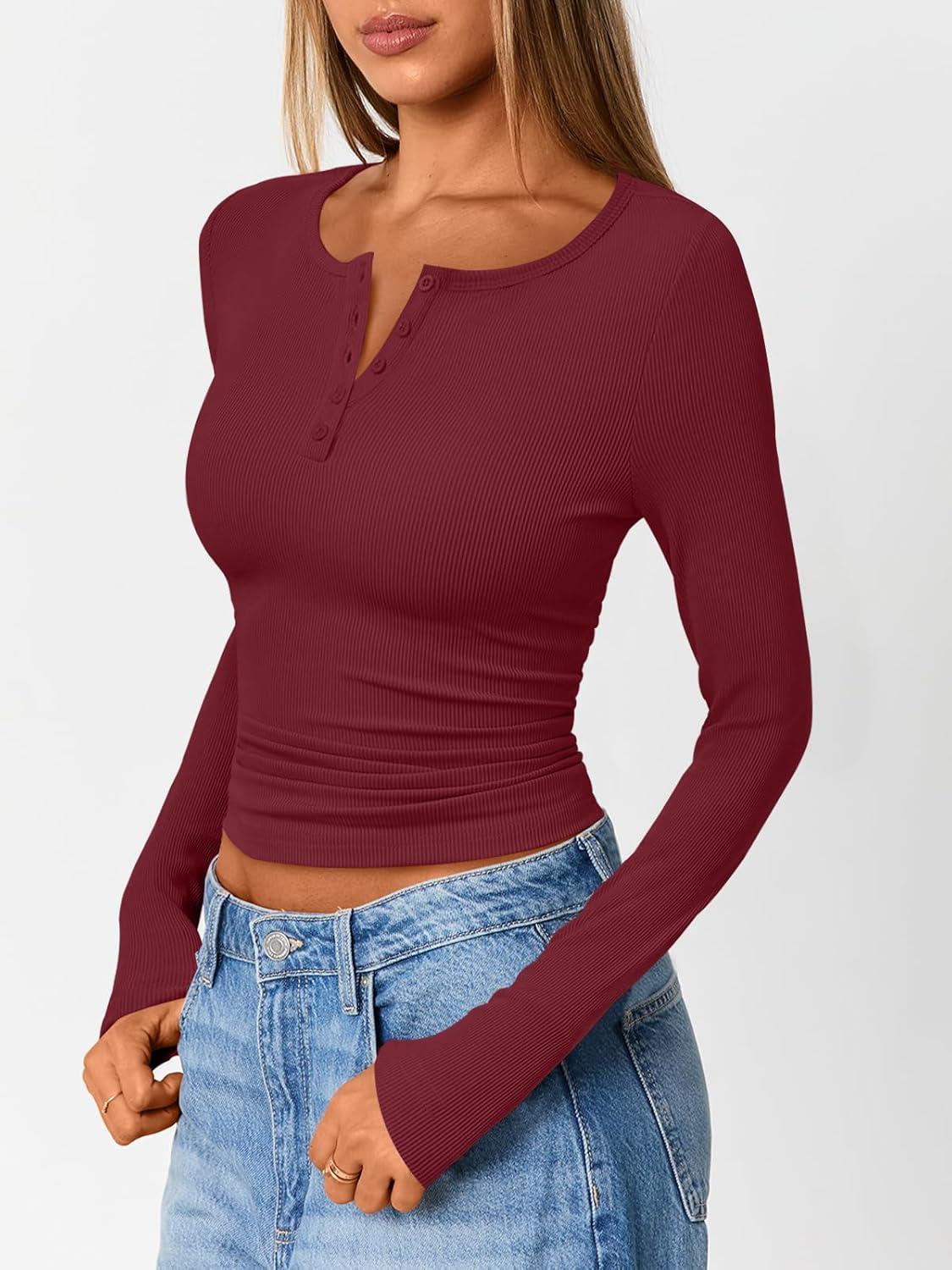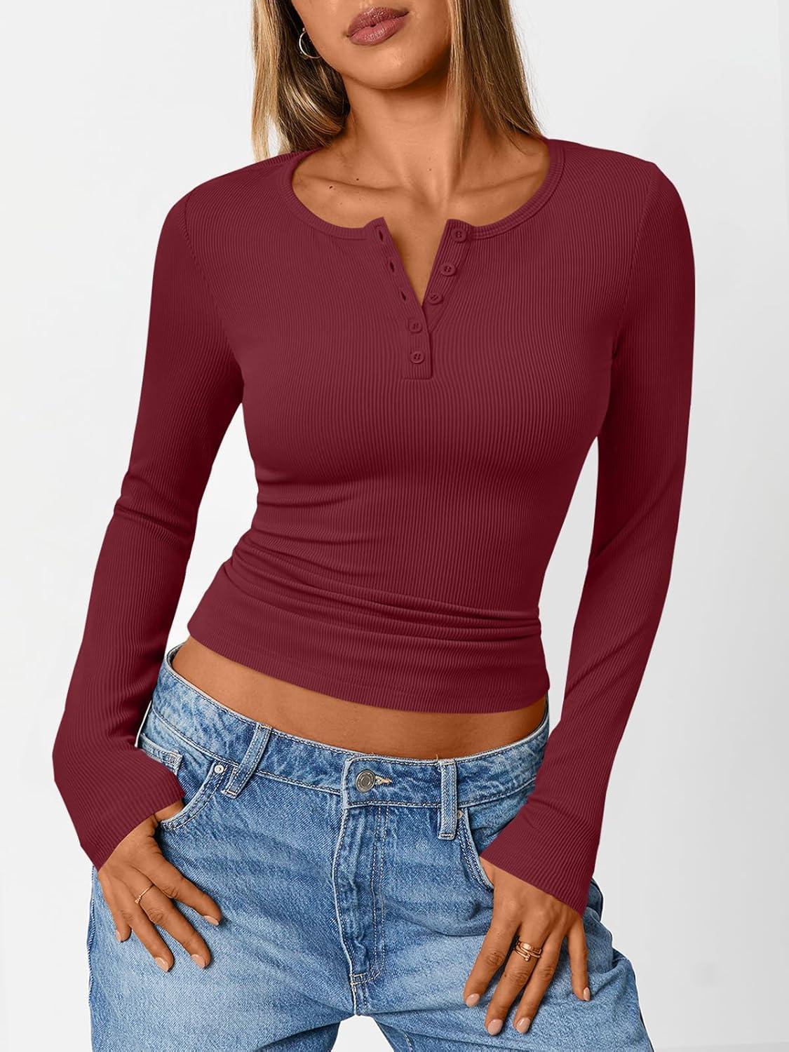 Trendy Queen Womens Long Sleeve Shirts 2025 Henley Casual Fall Outfits Fitted Tops Ribbed Fashion Basic Tees(Winered)