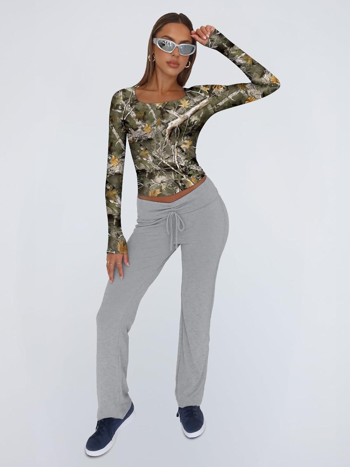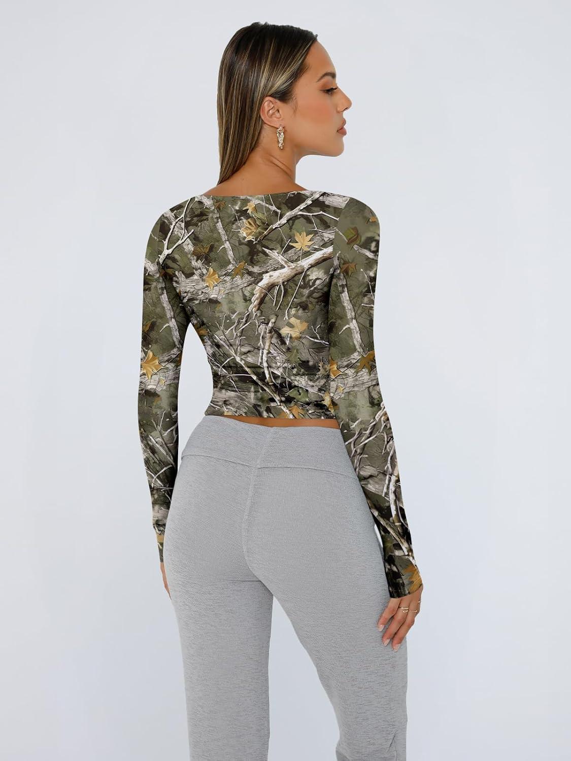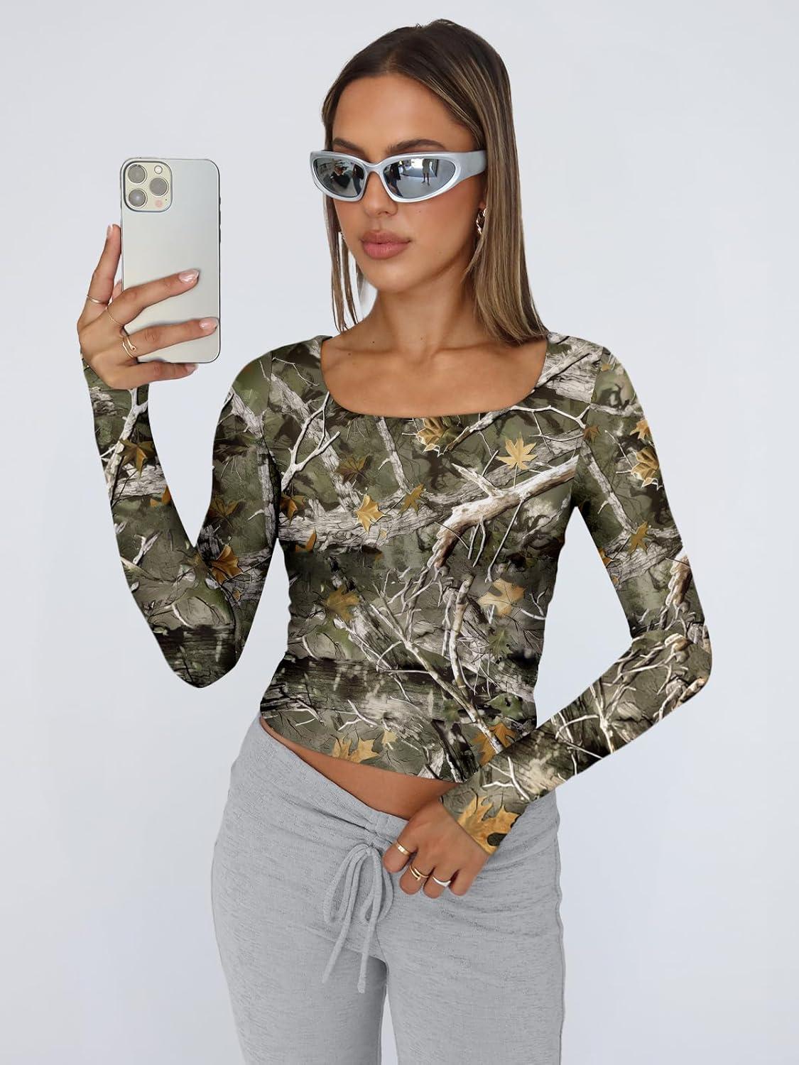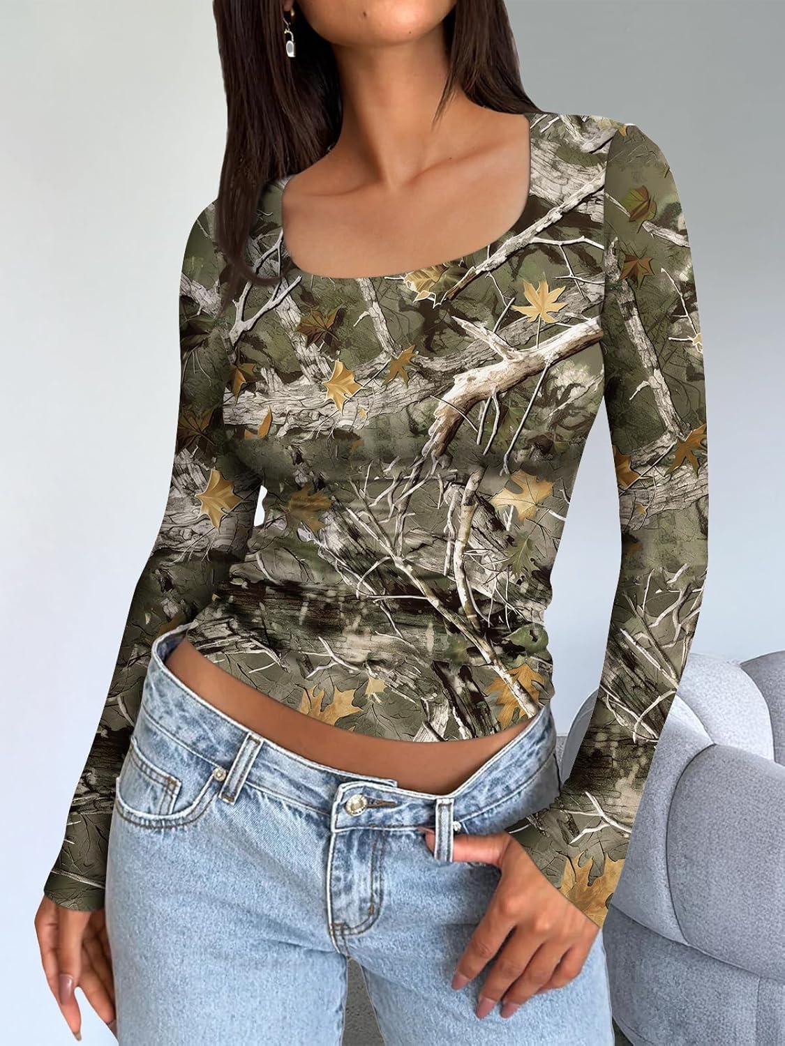 Trendy Queen Womens Long Sleeve Shirts Crop Tops Fall Fashion 2025 Square Neck Going Out Basics Tees Y2k Clothes(Camo)