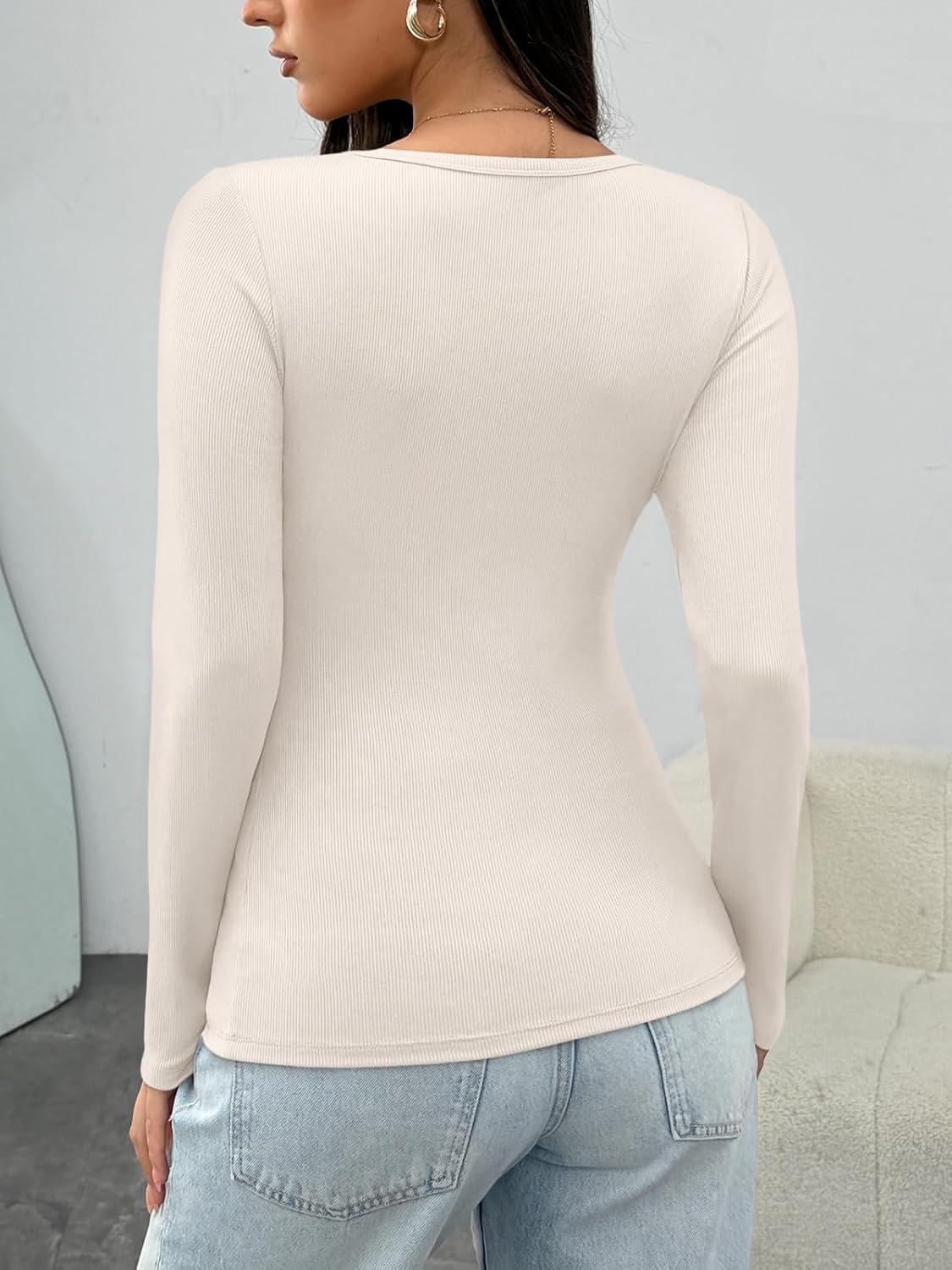 Trendy Queen Womens Long Sleeve Shirts V Neck Ribbed Knit Fall Tops(Beige)