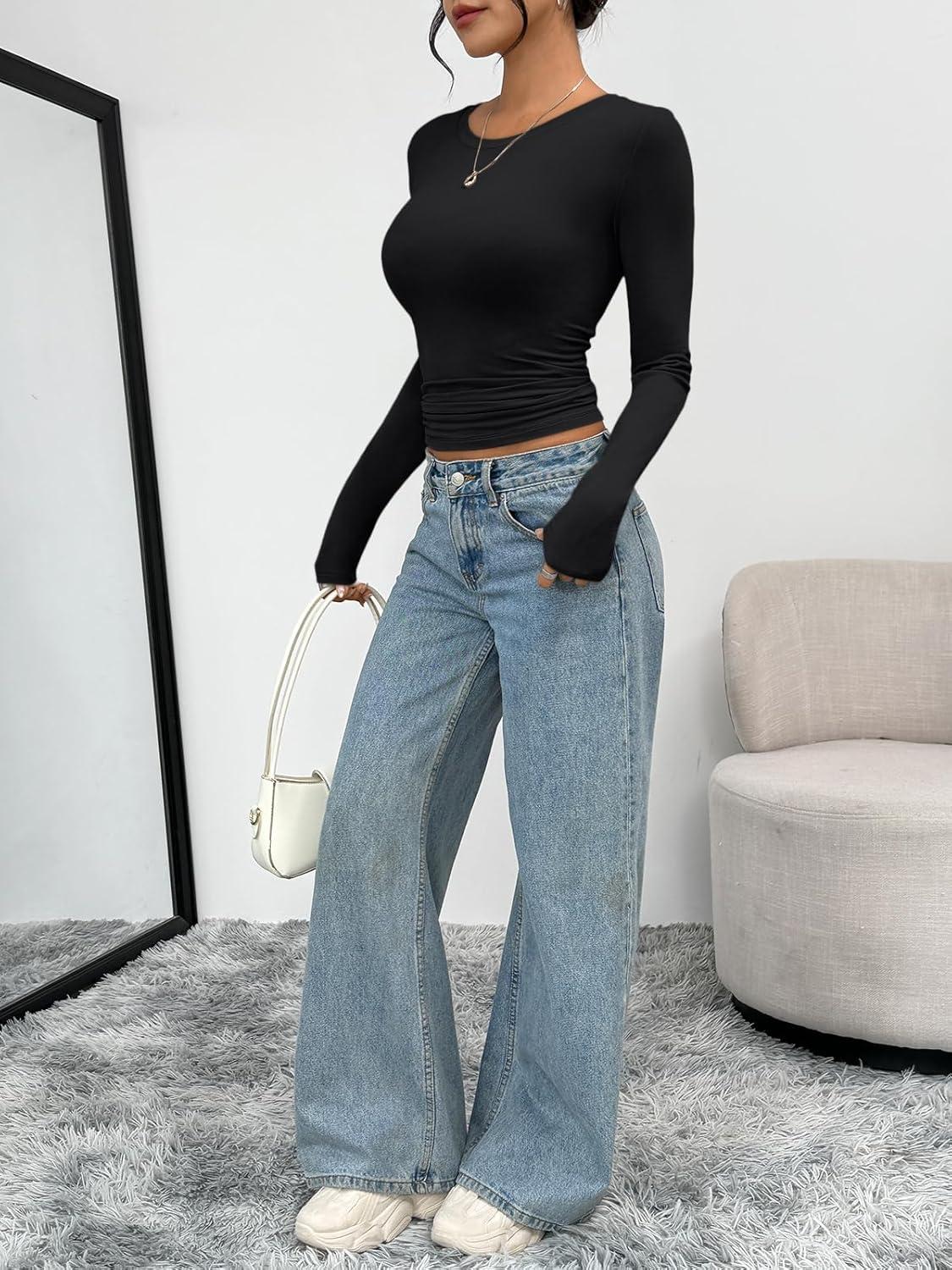 Trendy Queen Womens Long Sleeve T-Shirts Basic Crop Tops 2026 Spring Fashion Outfits Going Out Winter Clothes(Black)
