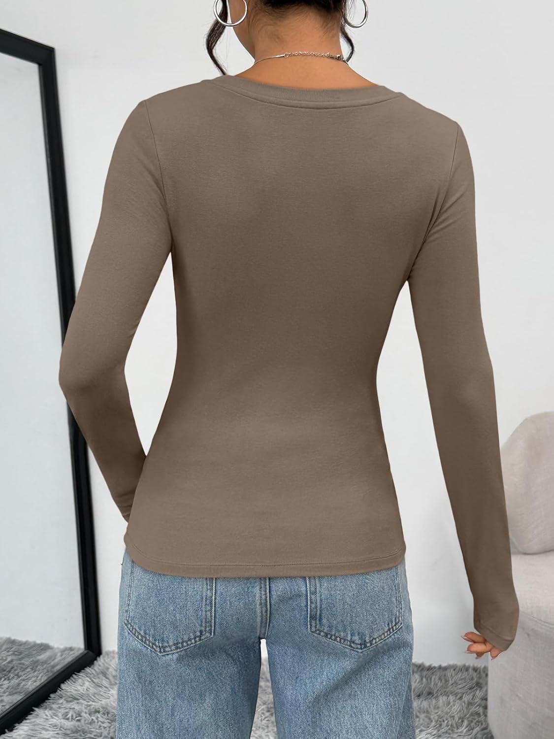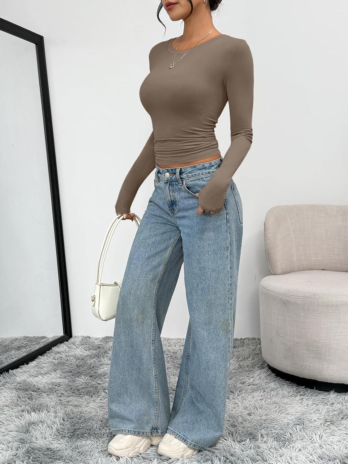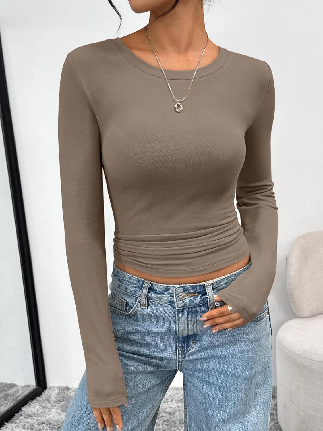 Trendy Queen Womens Long Sleeve T-Shirts Basic Crop Tops 2026 Spring Fashion Outfits Going Out Winter Clothes(Khaki)