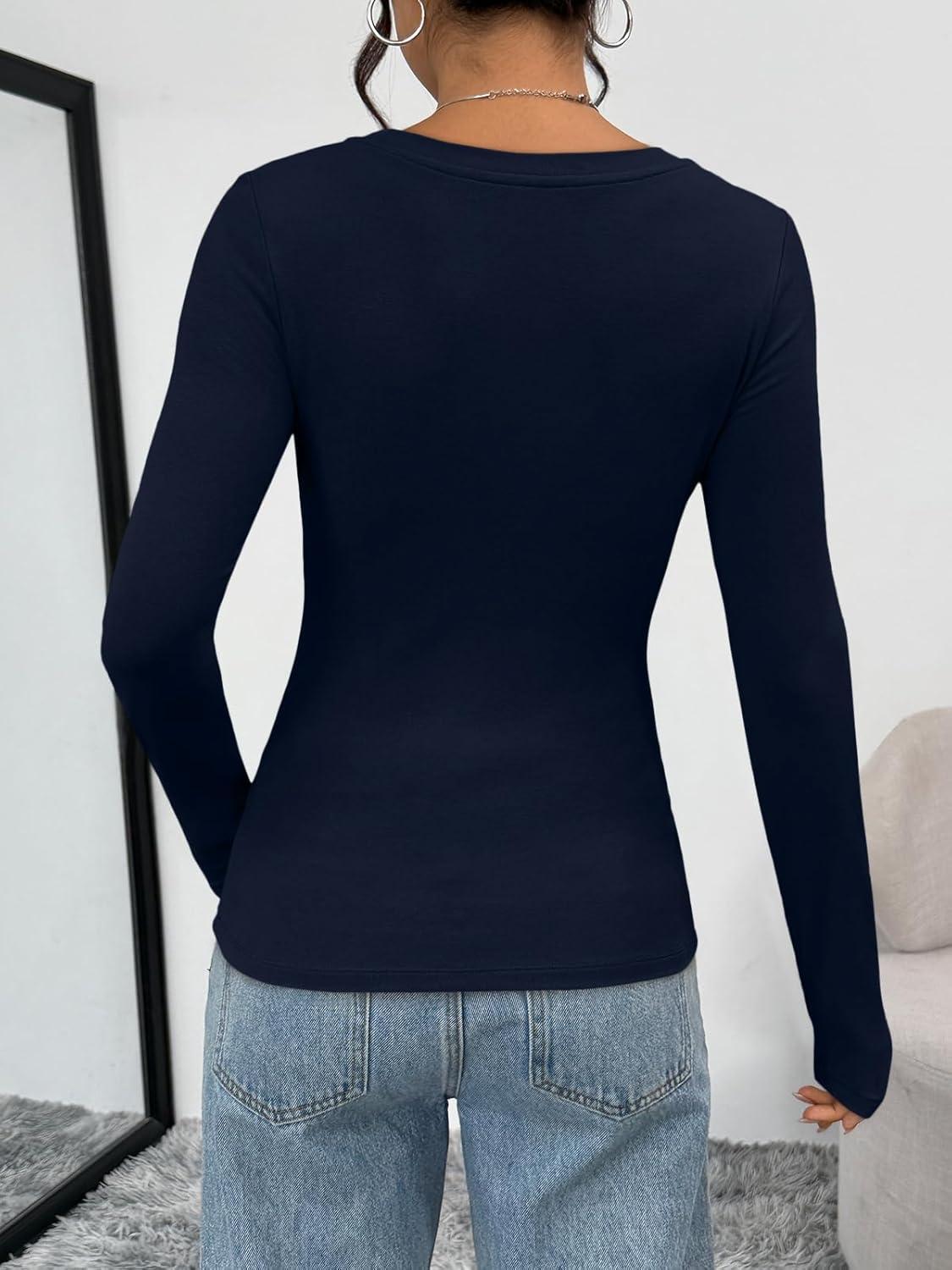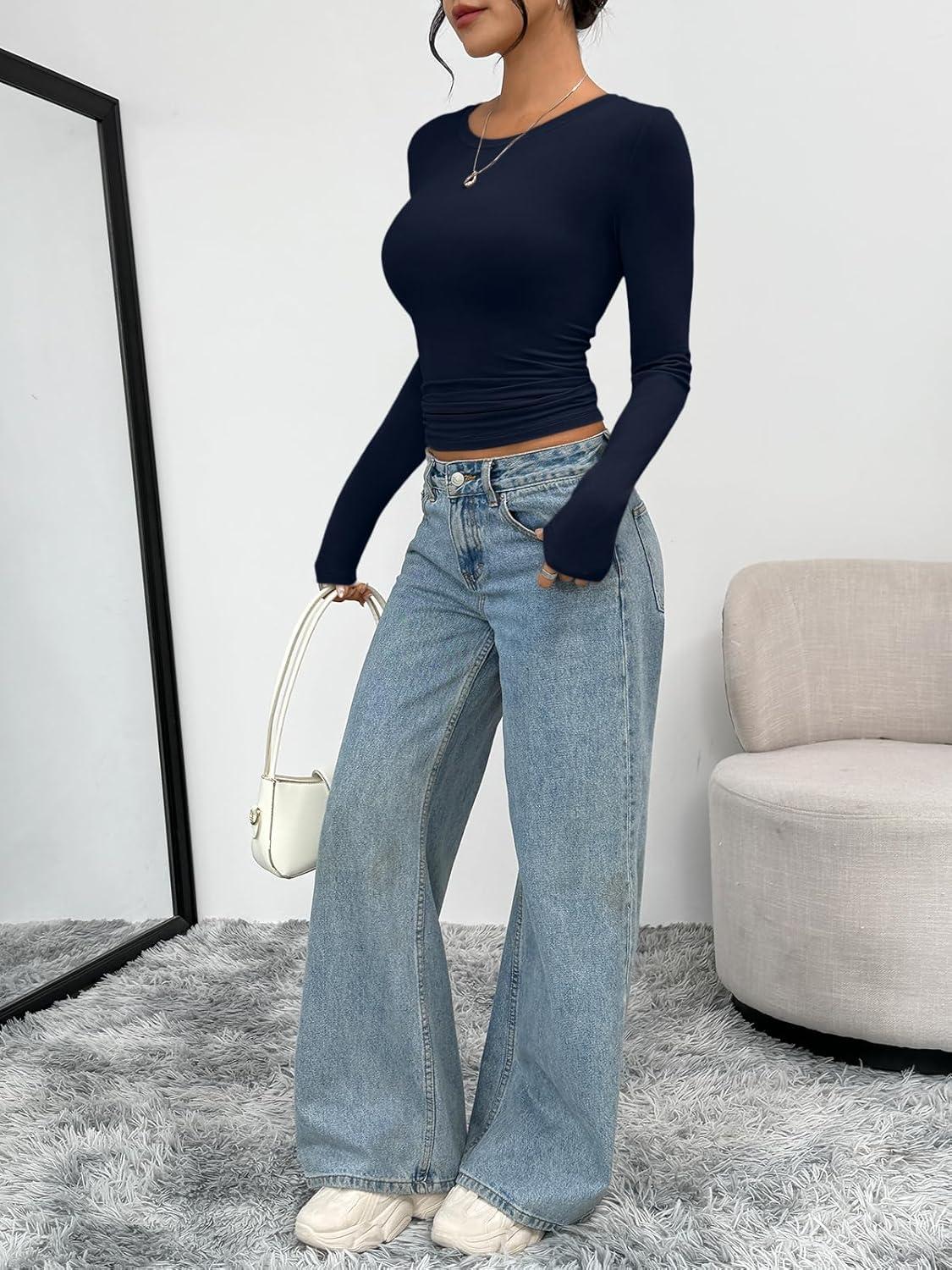 Trendy Queen Womens Long Sleeve T-Shirts Basic Crop Tops 2026 Spring Fashion Outfits Going Out Winter Clothes(Navy Blue)