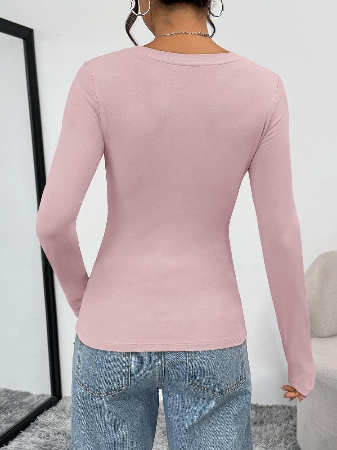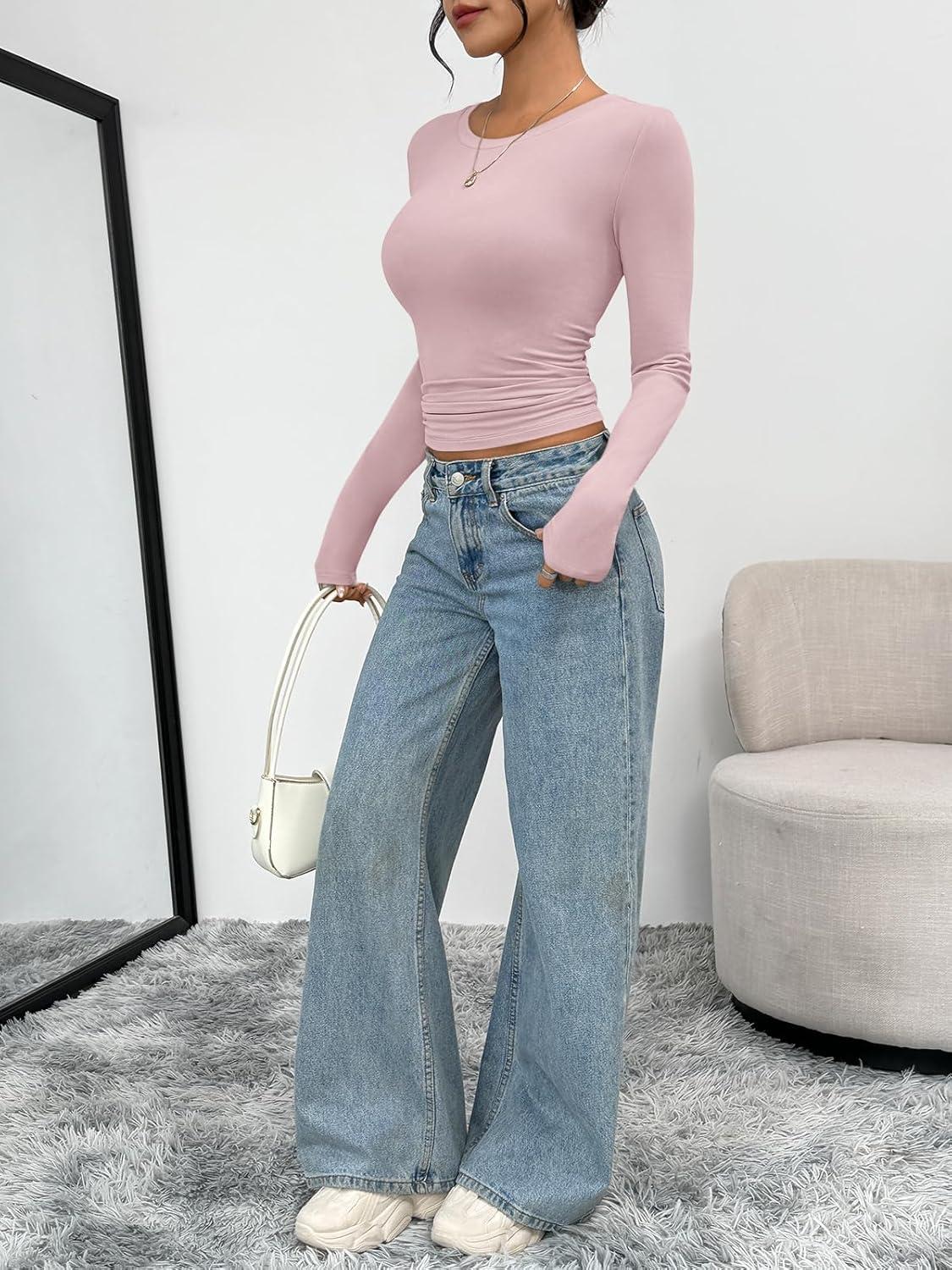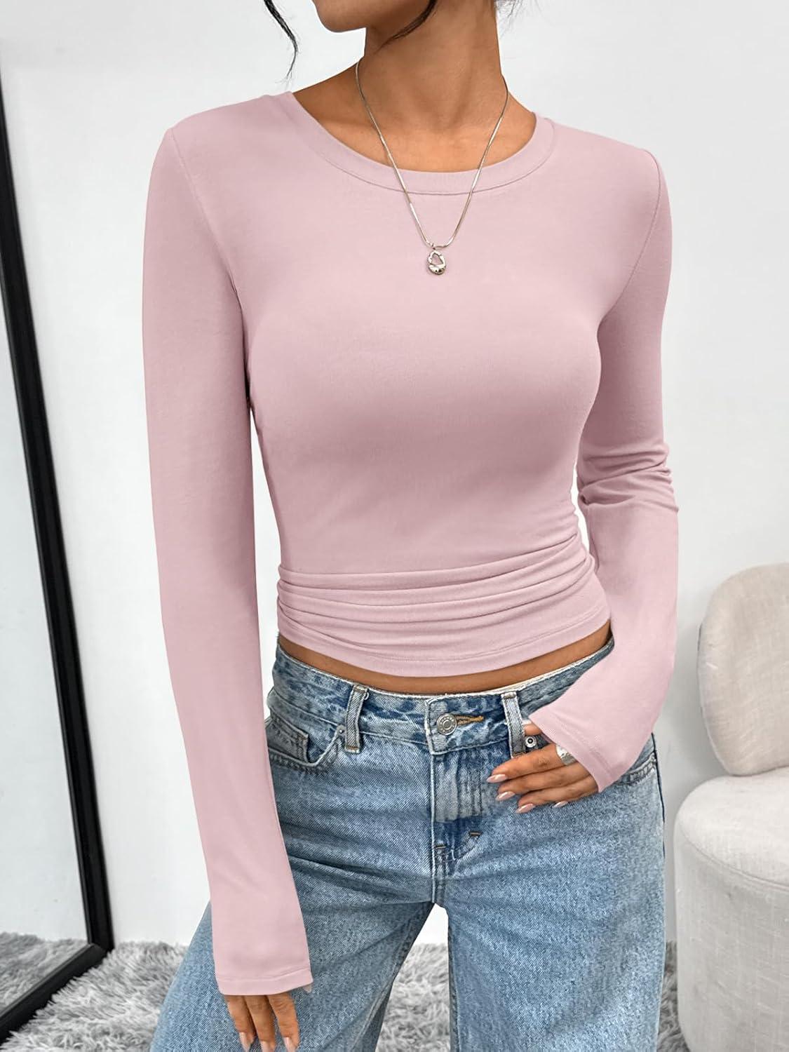 Trendy Queen Womens Long Sleeve T-Shirts Basic Crop Tops 2026 Spring Fashion Outfits Going Out Winter Clothes(Pink)