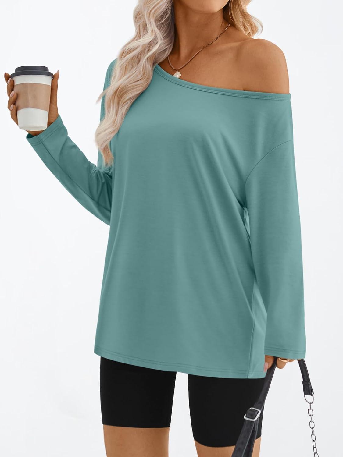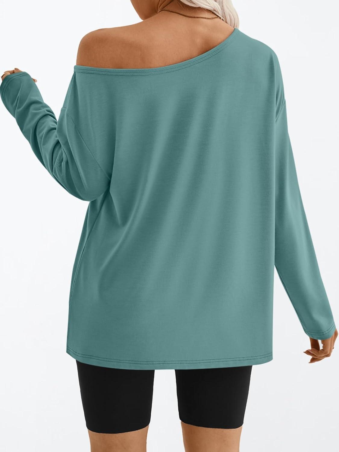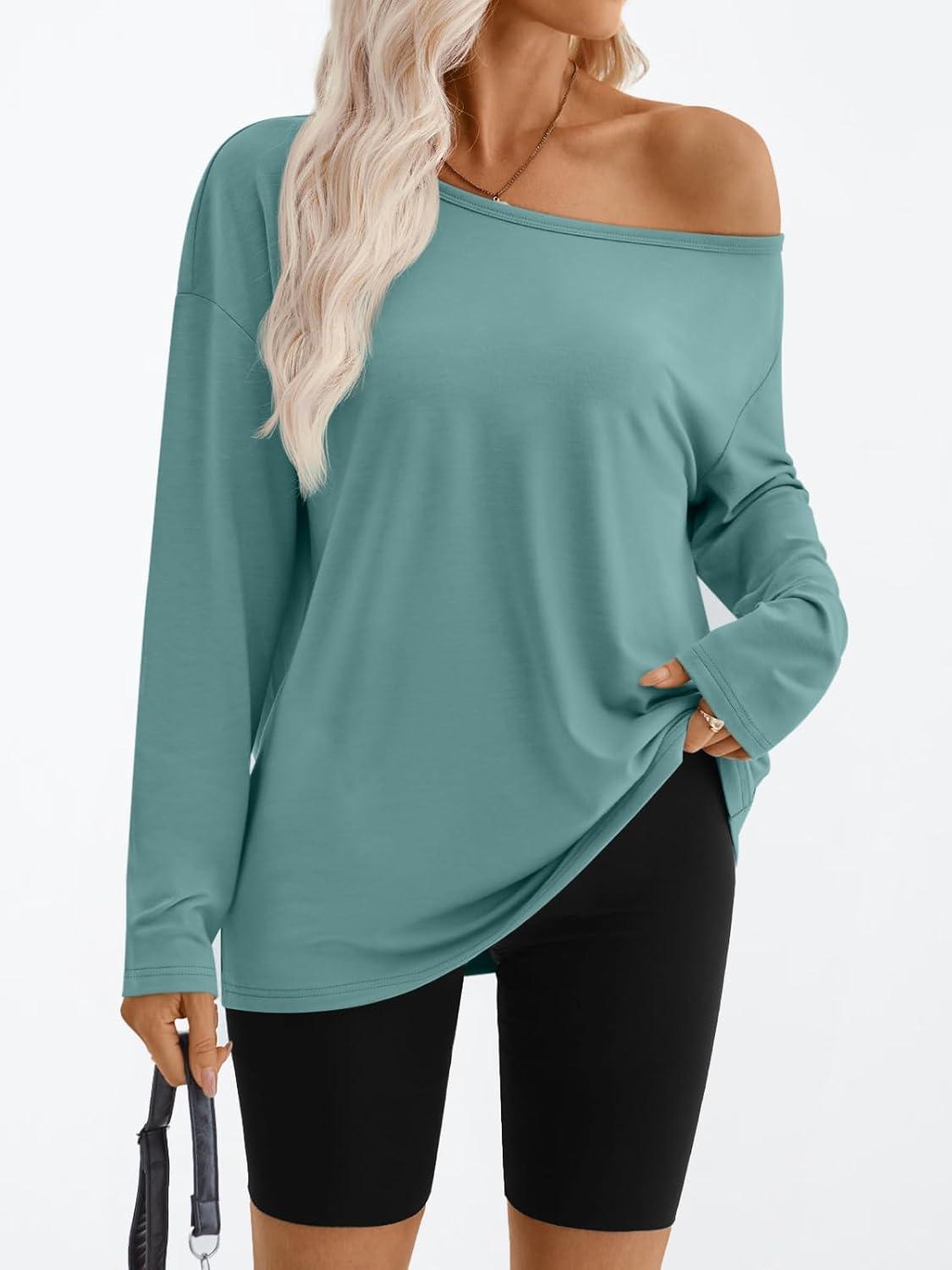 Trendy Queen Womens Off The Shoulder Tops Oversized Tshirts Long Sleeve 2025 Casual Basic Tees(Lake)
