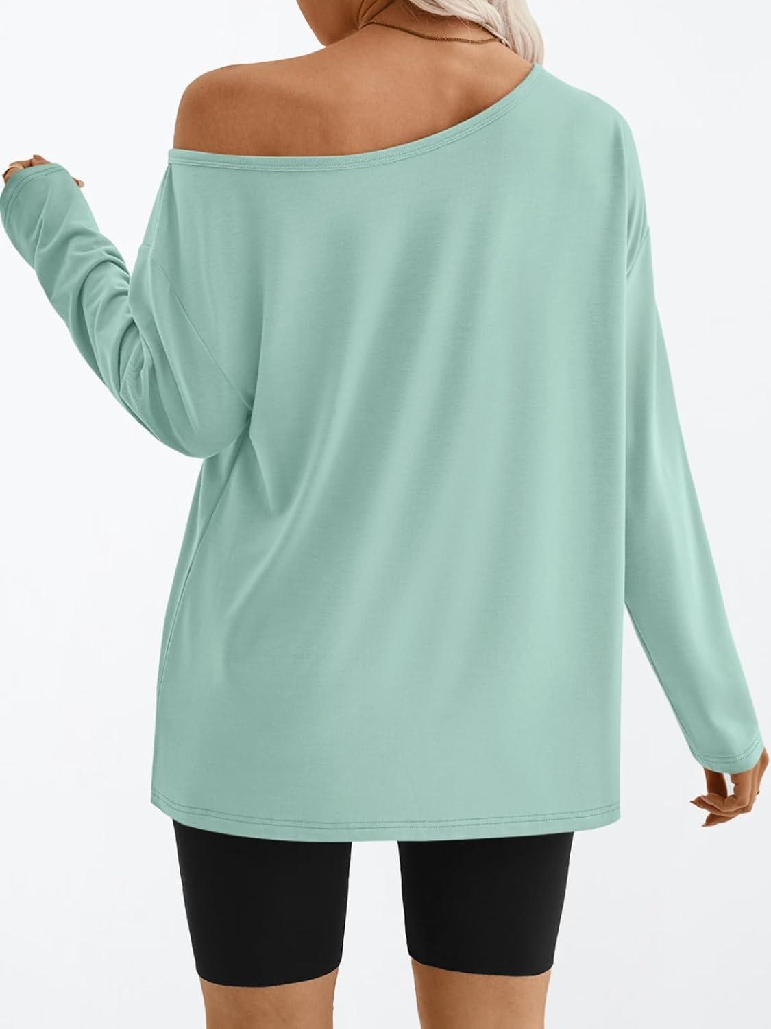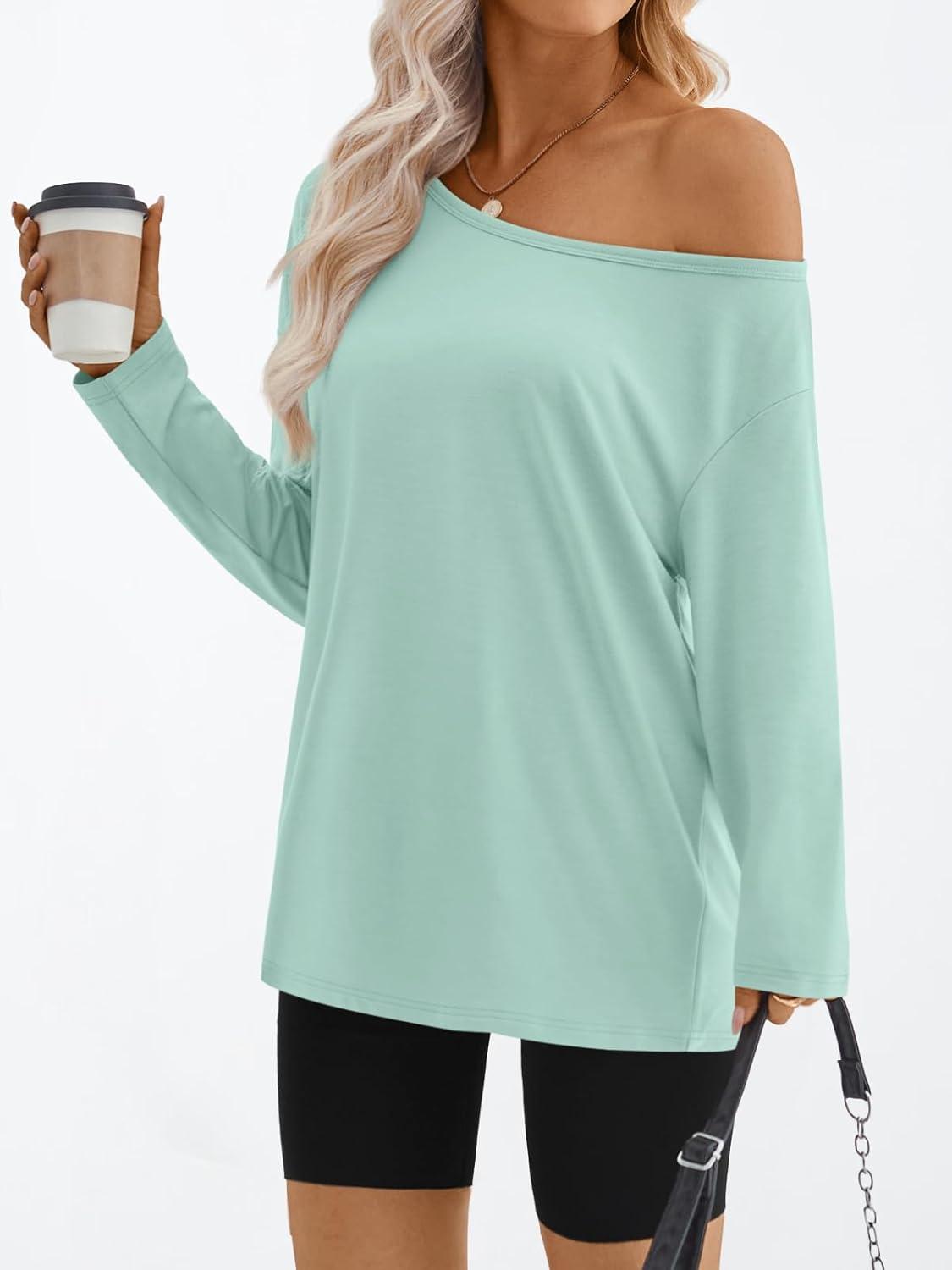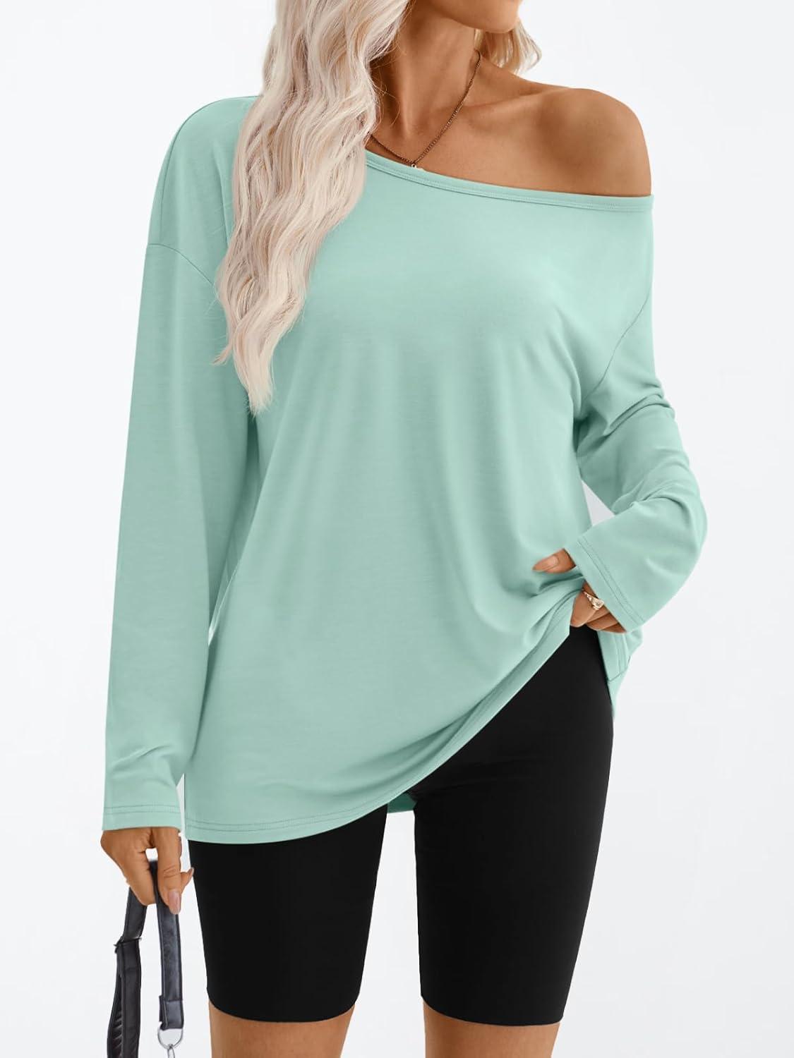 Trendy Queen Womens Off The Shoulder Tops Oversized Tshirts Long Sleeve 2025 Casual Basic Tees(Mint Green)