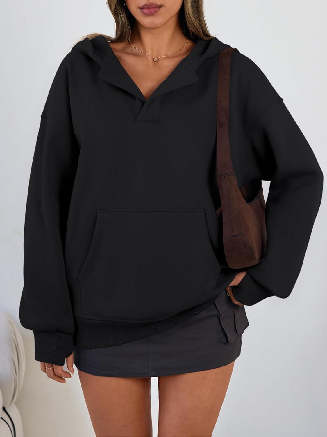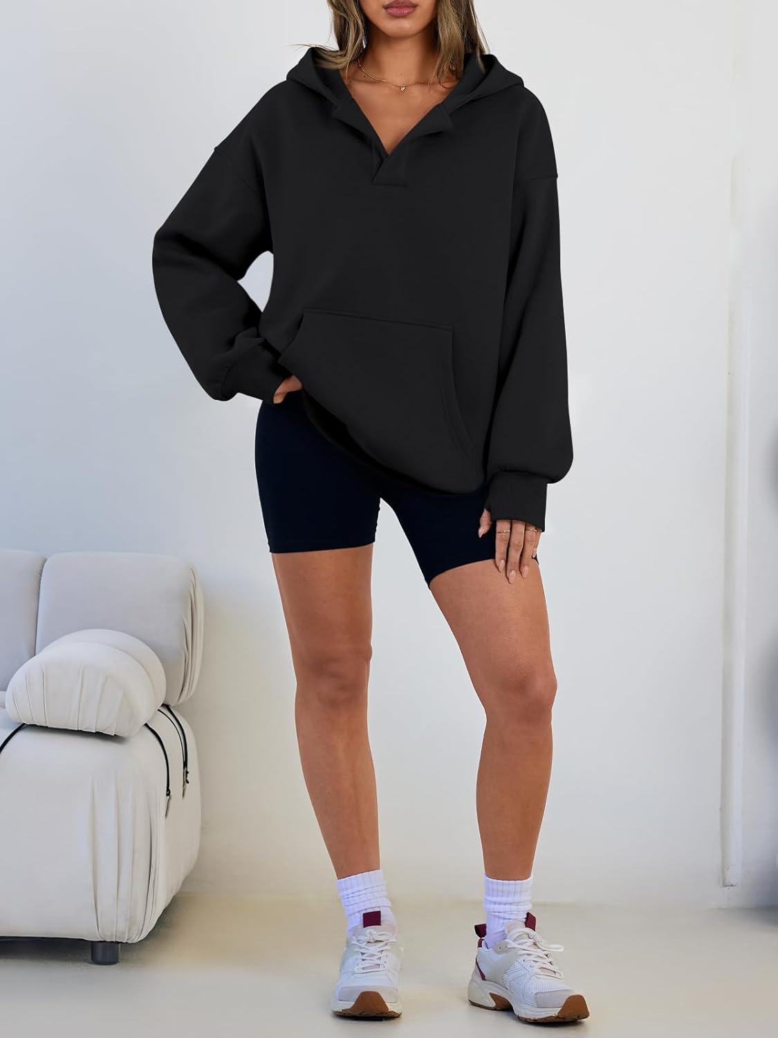 Trendy Queen Womens Oversized V Neck Hoodies with Thumb Hole Pullover Sweatshirts Y2k Clothes Fall Fashion Outfits 2025(Black)