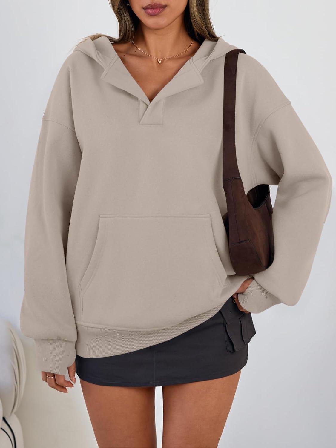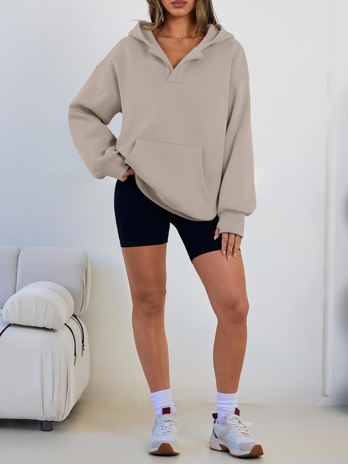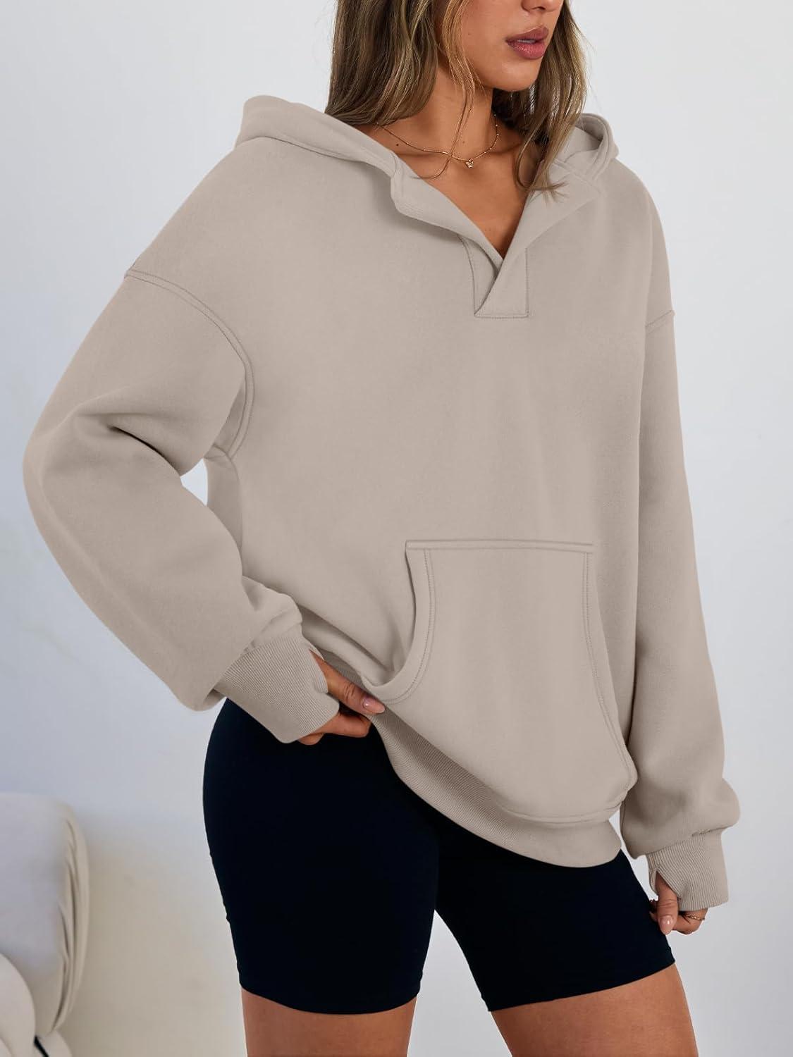 Trendy Queen Womens Oversized V Neck Hoodies with Thumb Hole Pullover Sweatshirts Y2k Clothes Fall Fashion Outfits 2025(Coffeegrey)