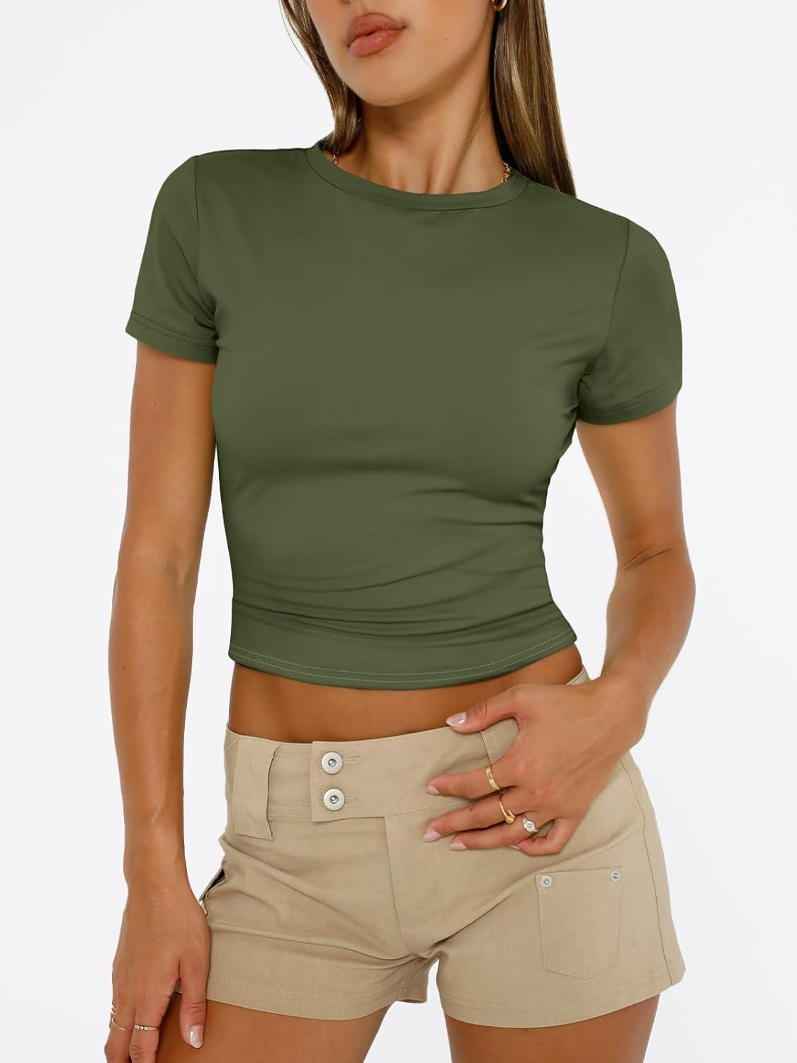 Trendy Queen Womens Short Sleeve T Shirts Summer Crop Tops Basic Slim Fit Gym Workout Y2k Clothes(Army Green)