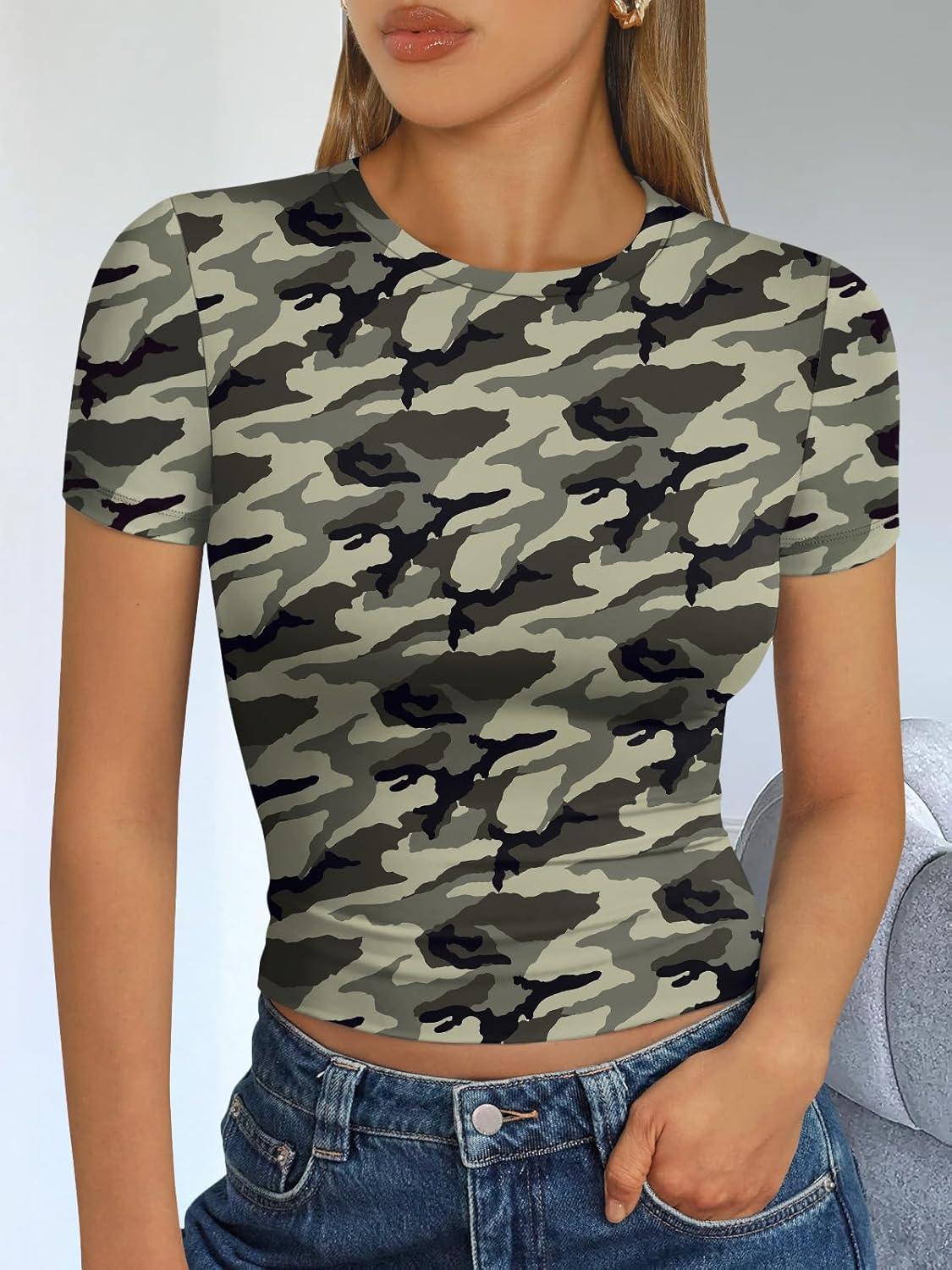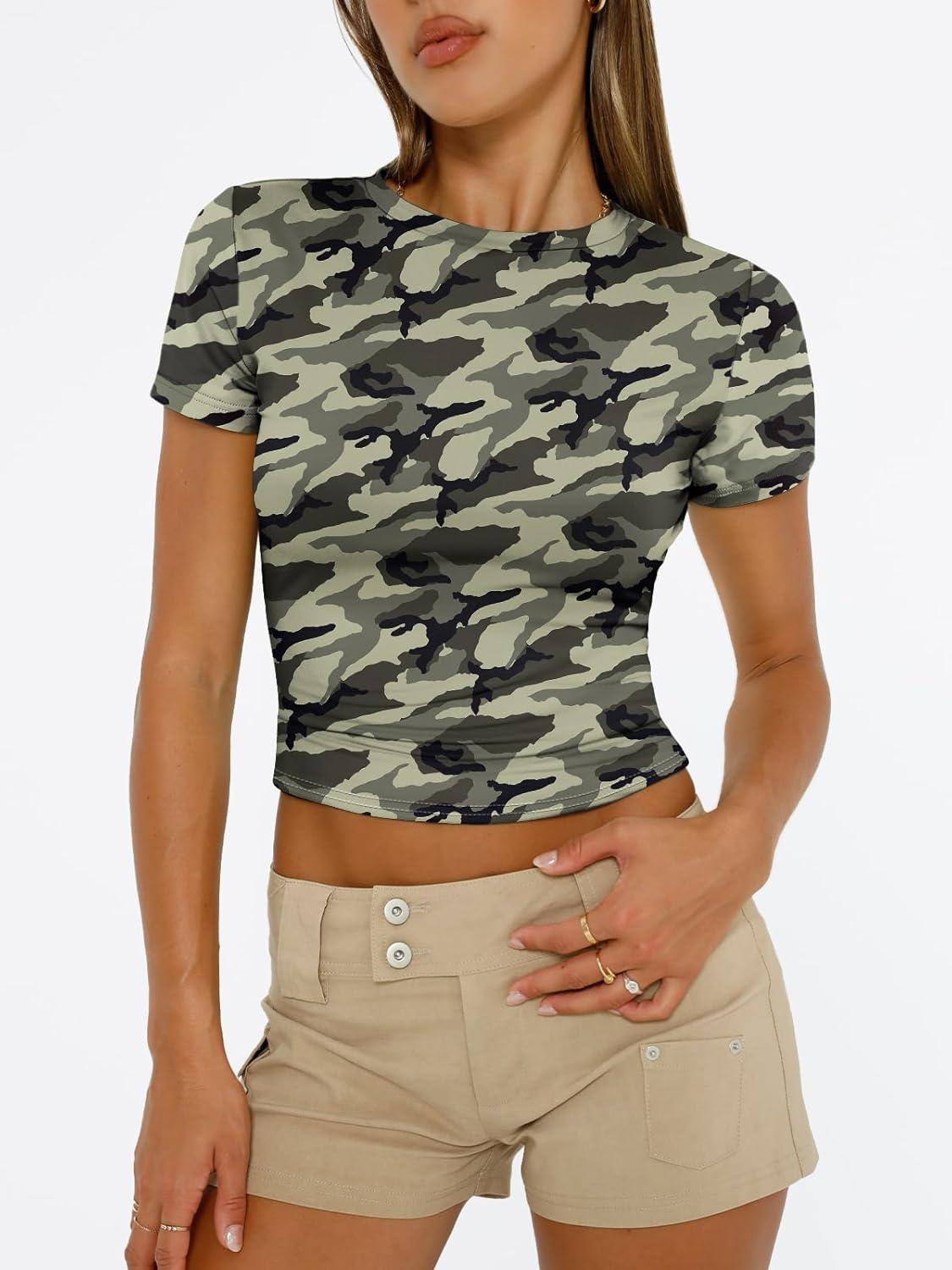 Trendy Queen Womens Short Sleeve T Shirts Summer Crop Tops Basic Slim Fit Gym Workout Y2k Clothes(Camo)