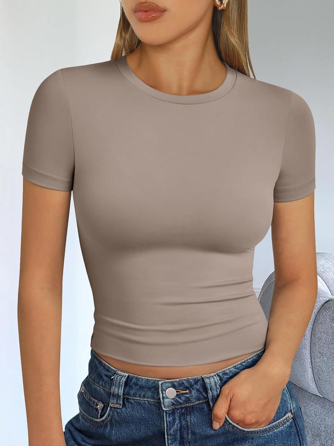 Trendy Queen Womens Short Sleeve T Shirts Summer Crop Tops Basic Slim Fit Gym Workout Y2k Clothes(Taupe)