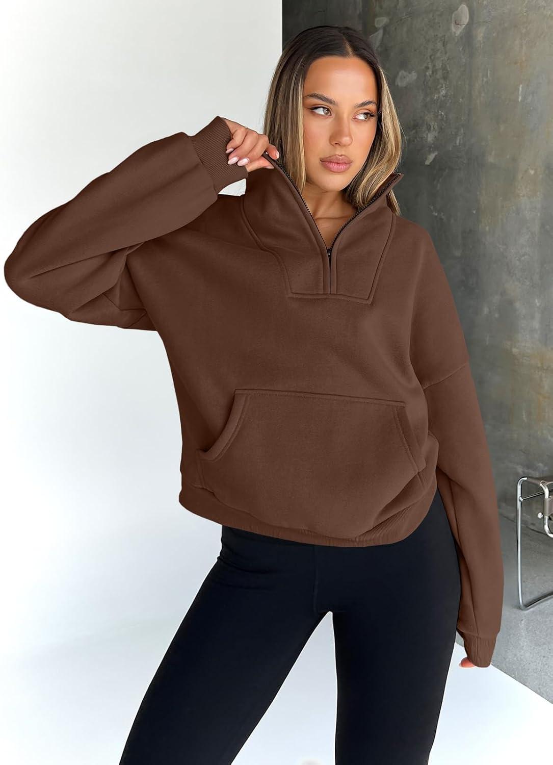 Trendy Queen Womens Sweatshirts Quarter Half Zip Pullover Oversized Hoodies Fall Fashion 2025 Winter Fleece Jackets Sweaters(Brown)