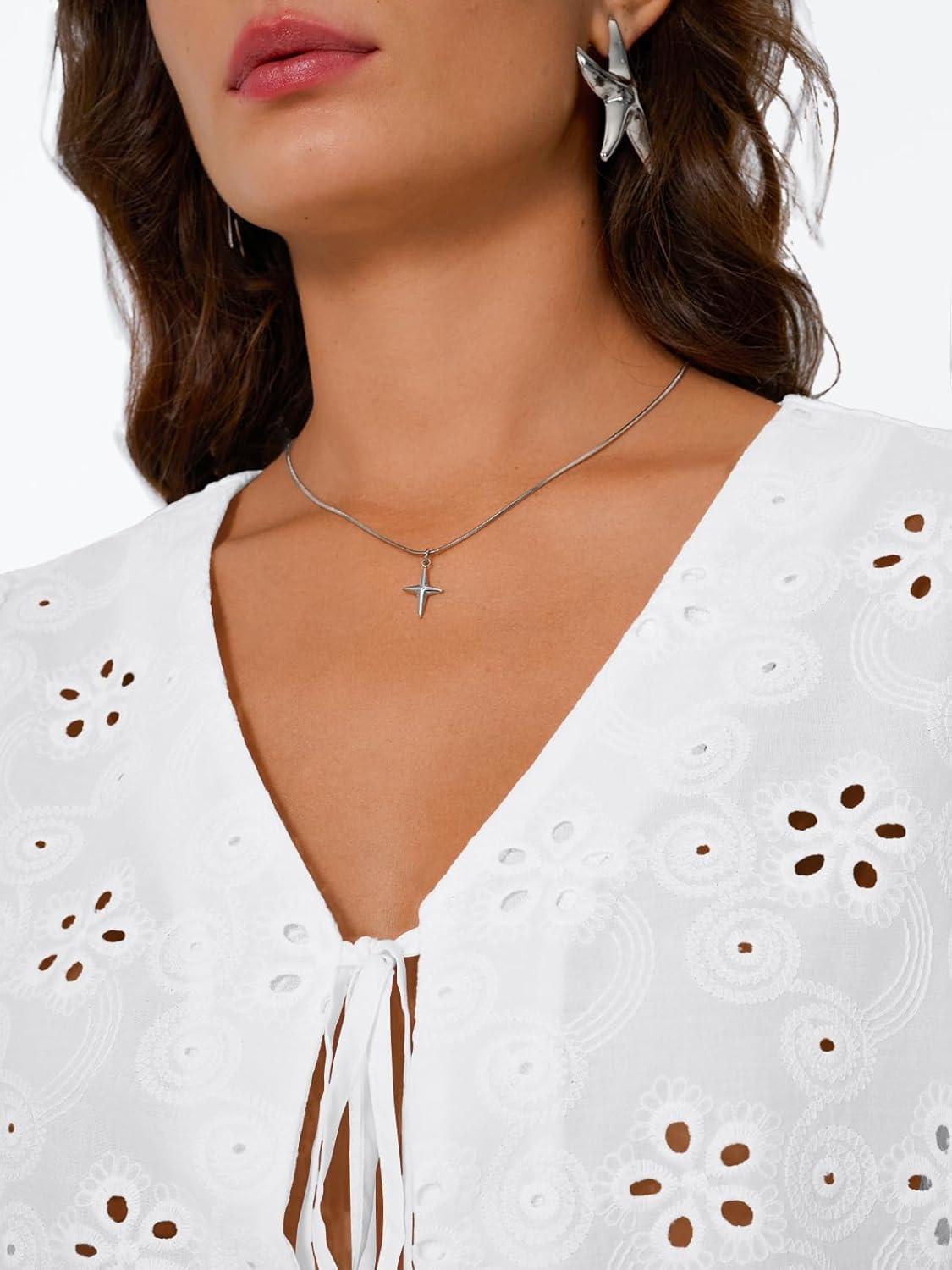 Trendy Queen Womens Tie Front Tops Summer Beach Vacation 2026 Fashion Outfits Loose Fit Blouses Eyelet Embroidered Clothes(White)