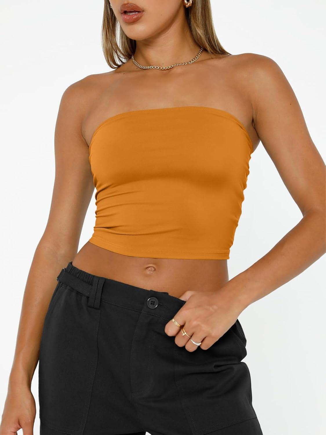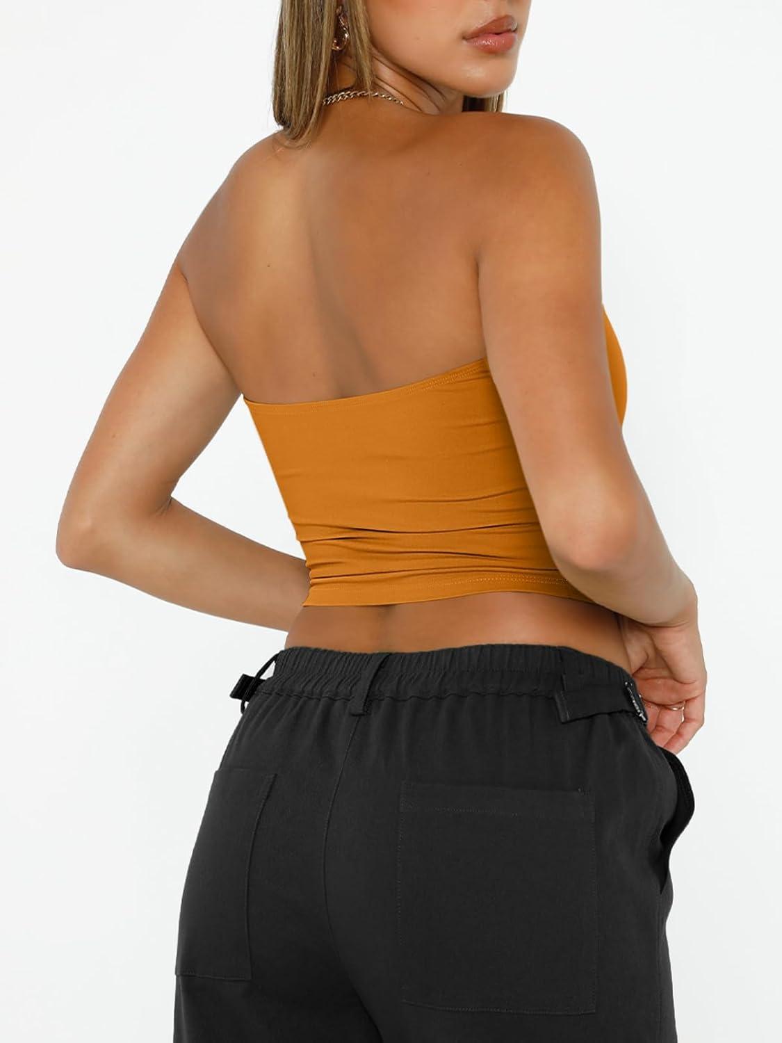 Trendy Queen Womens Tube Tops Strapless Crop Tops Basic Backless Sleeveless Going Out 2026 Spring Outfits Summer Clothes(Golden Ochre)