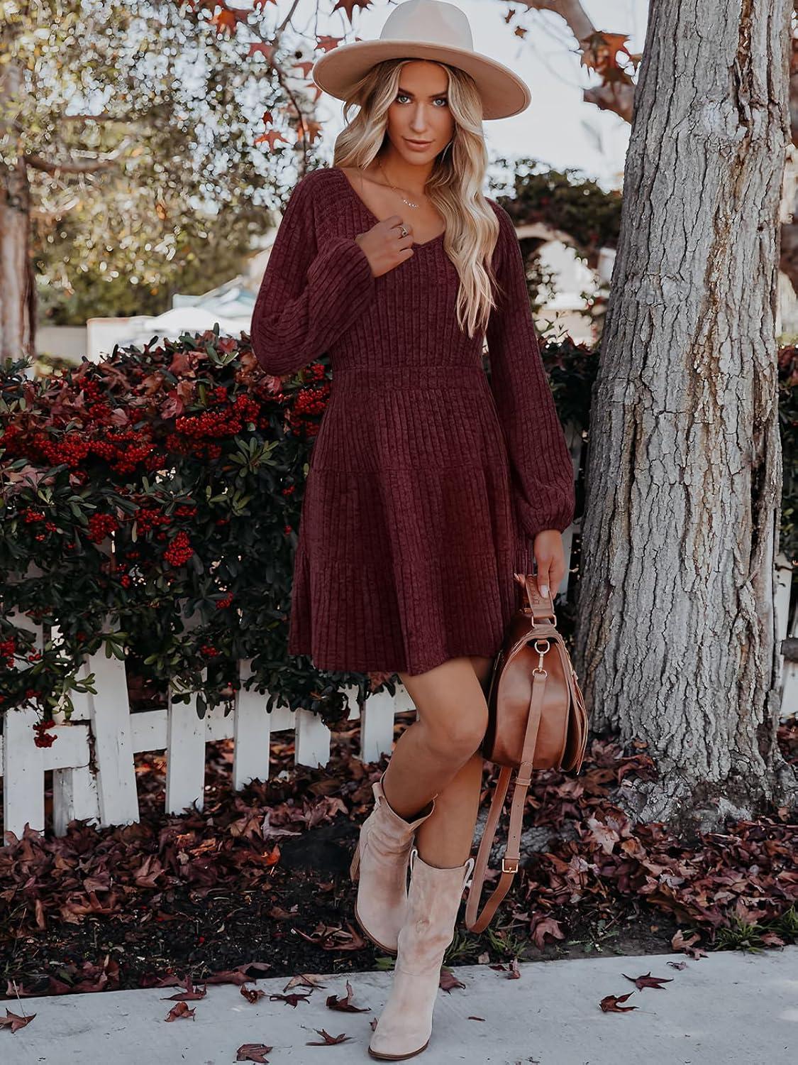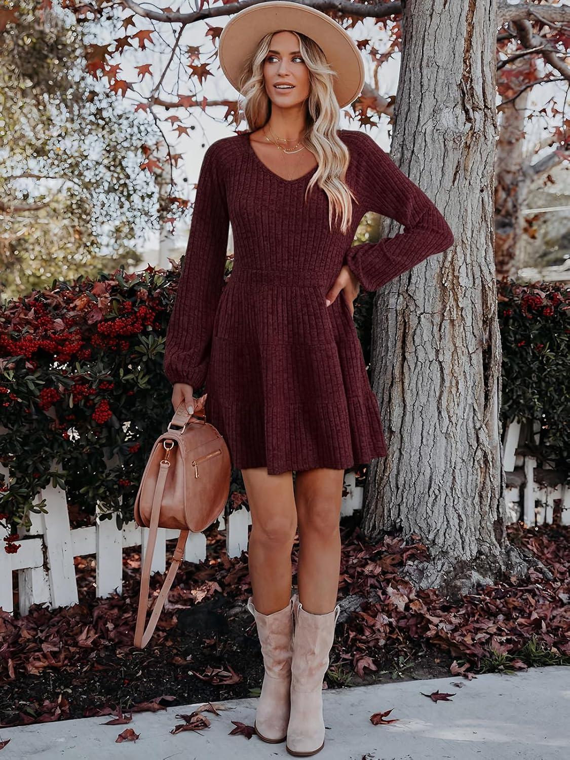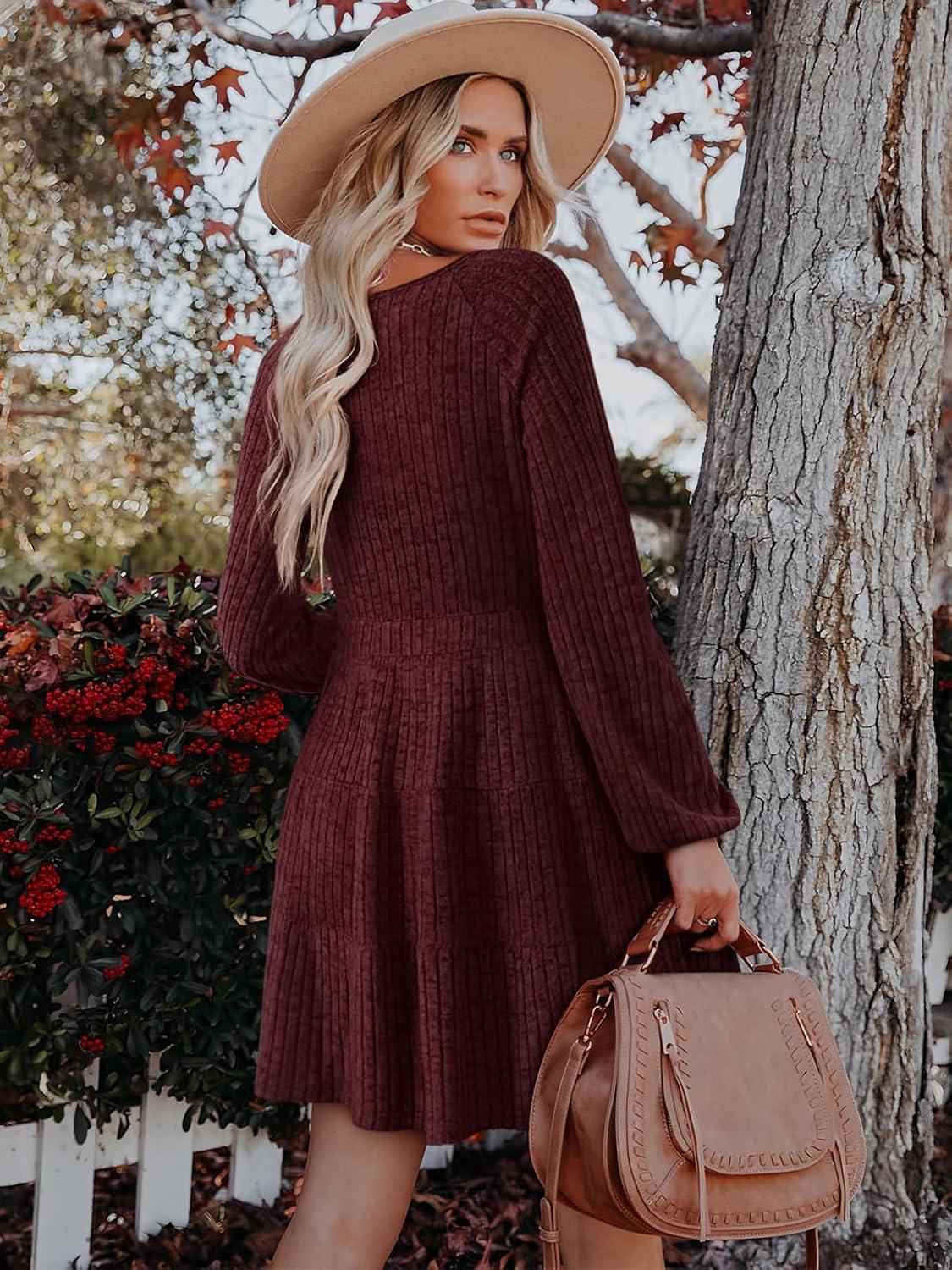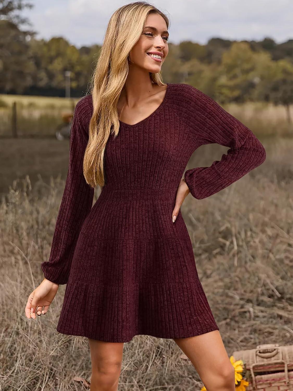 Women's Long Sleeve V Neck Sweater Dress Ribbed Knit Casual Babydoll Tiered Short Mini Fall Tunic Dresses(Burgundy)