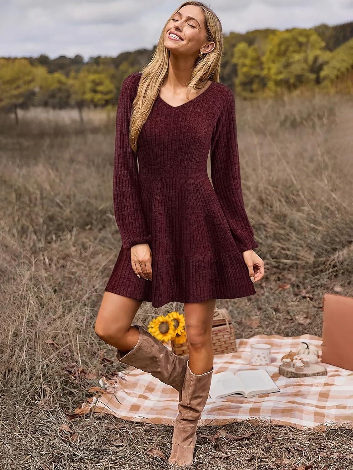 Women’s Long Sleeve V Neck Sweater Dress Ribbed Knit Casual Babydoll Tiered Short Mini Fall Tunic Dresses(Burgundy)