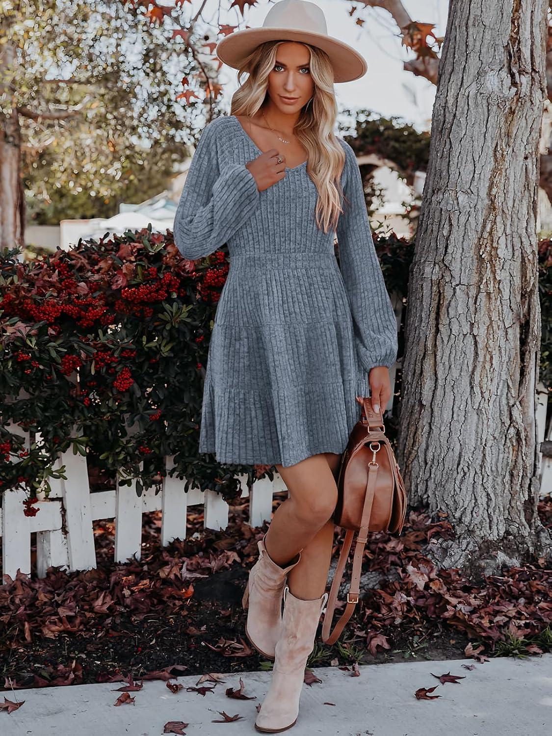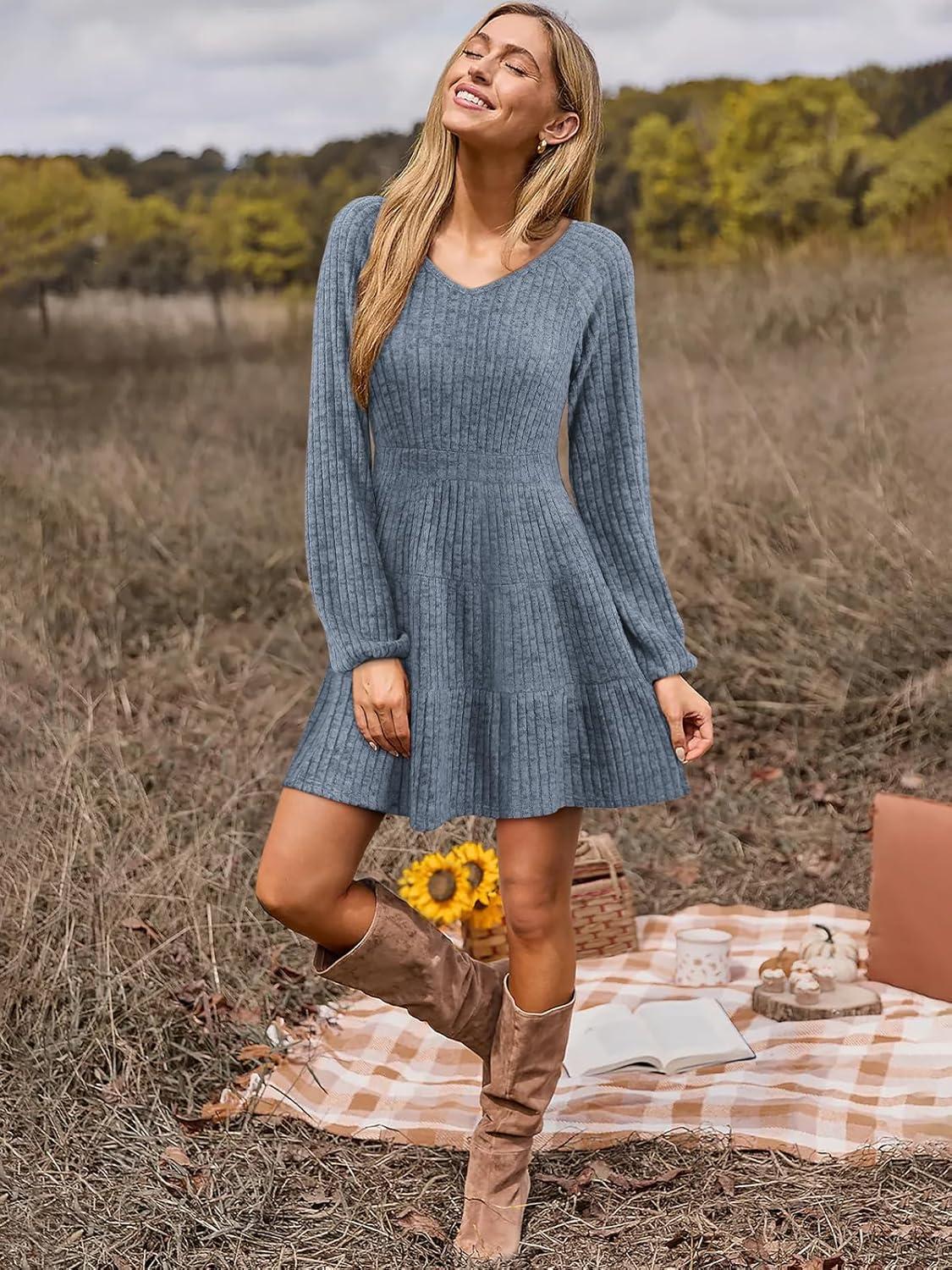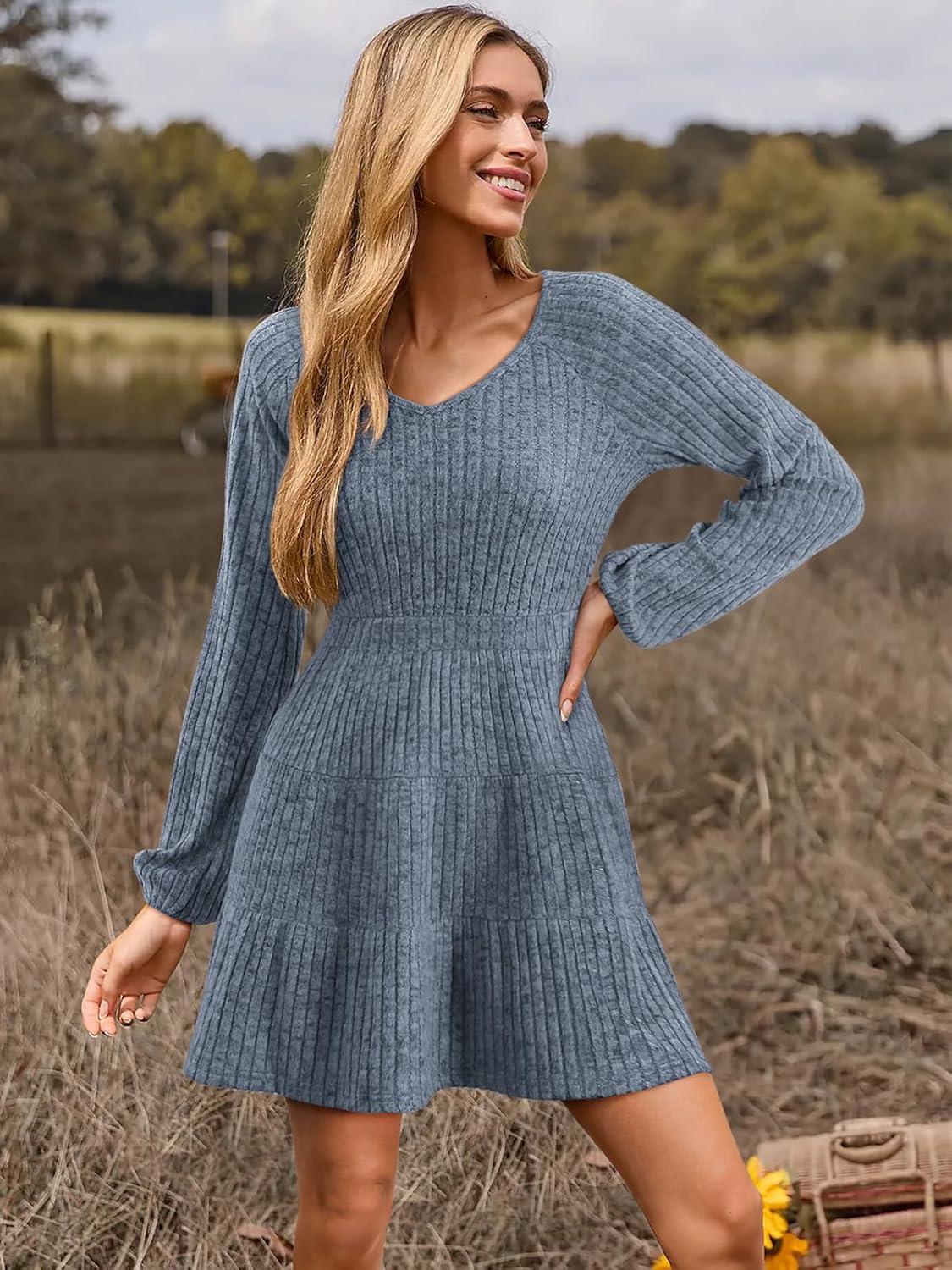 Women’s Long Sleeve V Neck Sweater Dress Ribbed Knit Casual Babydoll Tiered Short Mini Fall Tunic Dresses(Grey Blue)